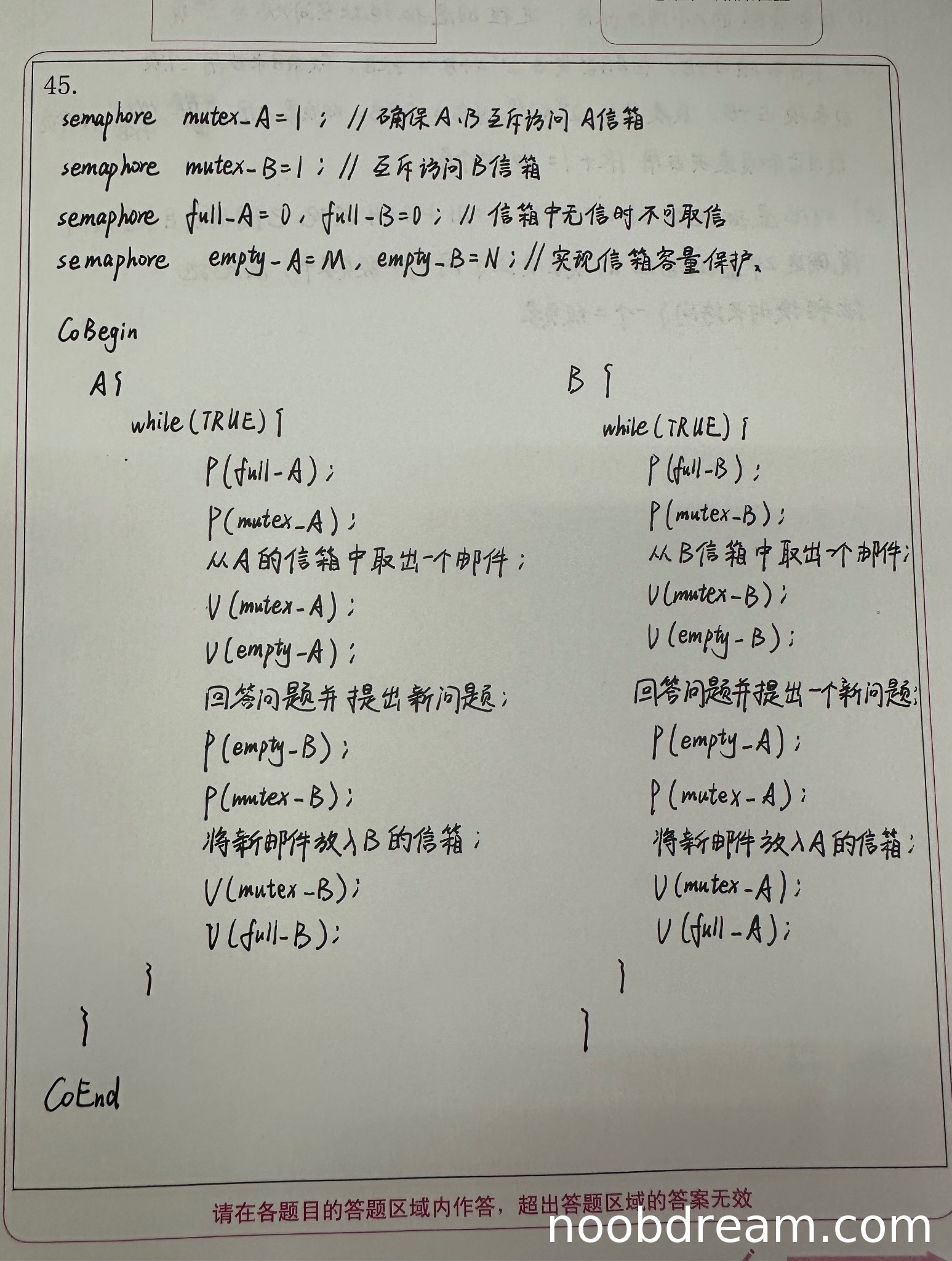 理由:与A进程同理,B进程的P、V操作顺序正确,互斥操作使用正确。但full_B的初值错误导致同步逻辑问题,扣0.5分。其余部分符合要求。