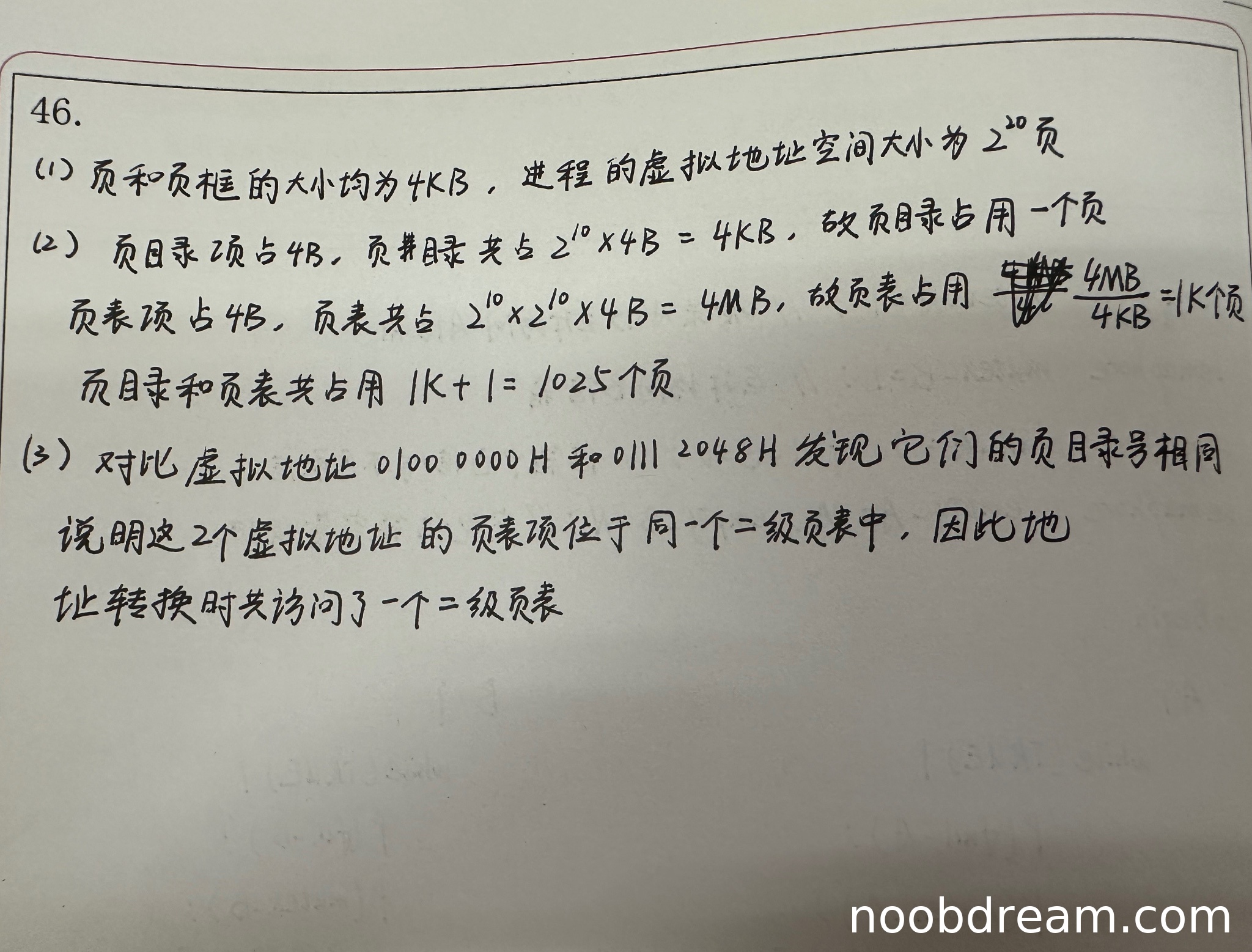 学生答案正确。页目录项数为2^10,每个占4B,故页目录大小为4KB,占用1页。页表项总数为2^20,每个占4B,故所有页表总大小为4MB,占用4MB/4KB = 1024页。总页数为1 + 1024 = 1025页。计算过程与结果均正确。得2分。
