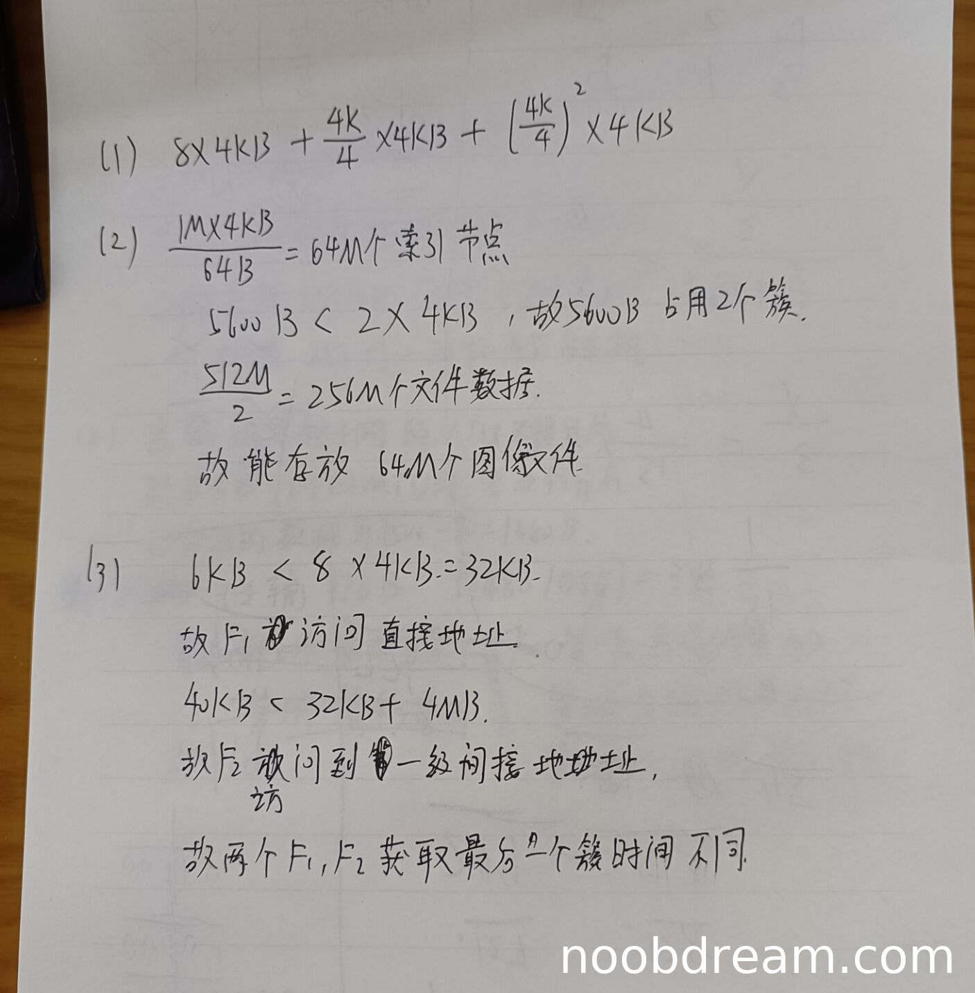 学生答案中给出的表达式为:\(8 \times 4KB + \frac{4K}{4} \times 4KB + (\frac{4K}{4})^2 \times 4KB\),这仅计算了直接、一级和二级间接地址项,缺少三级间接地址项的计算。标准答案中最大文件长度应包含直接、一级、二级和三级间接地址项的全部贡献。因此,该表达式不完整,属于逻辑错误。扣1分,得1分。