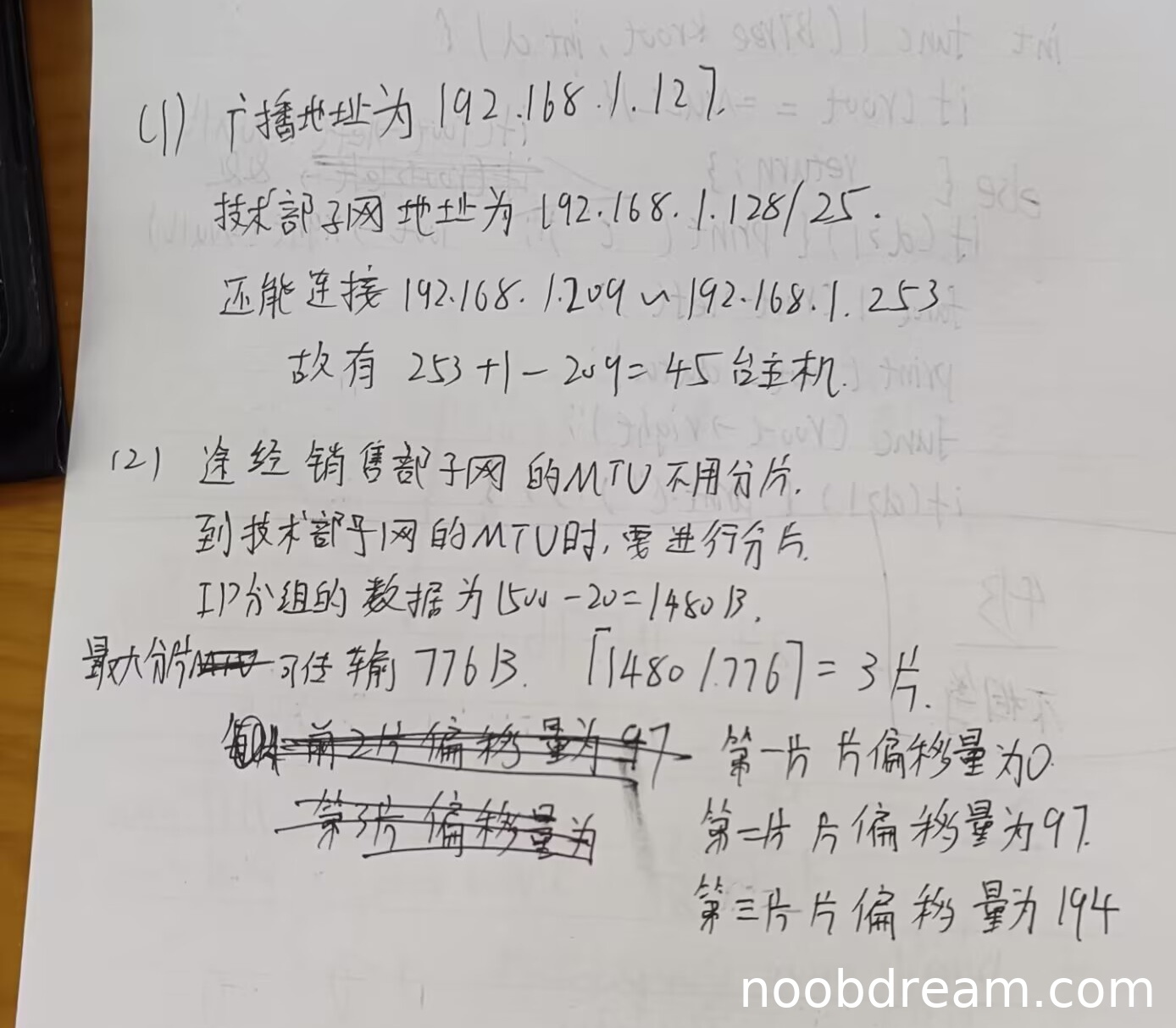 第二问:分片数量计算为3片,但标准答案为2片。错误原因:1480B数据按776B分片,第一片776B,第二片704B(1480-776=704),无需第三片。此处存在逻辑错误,扣1分。