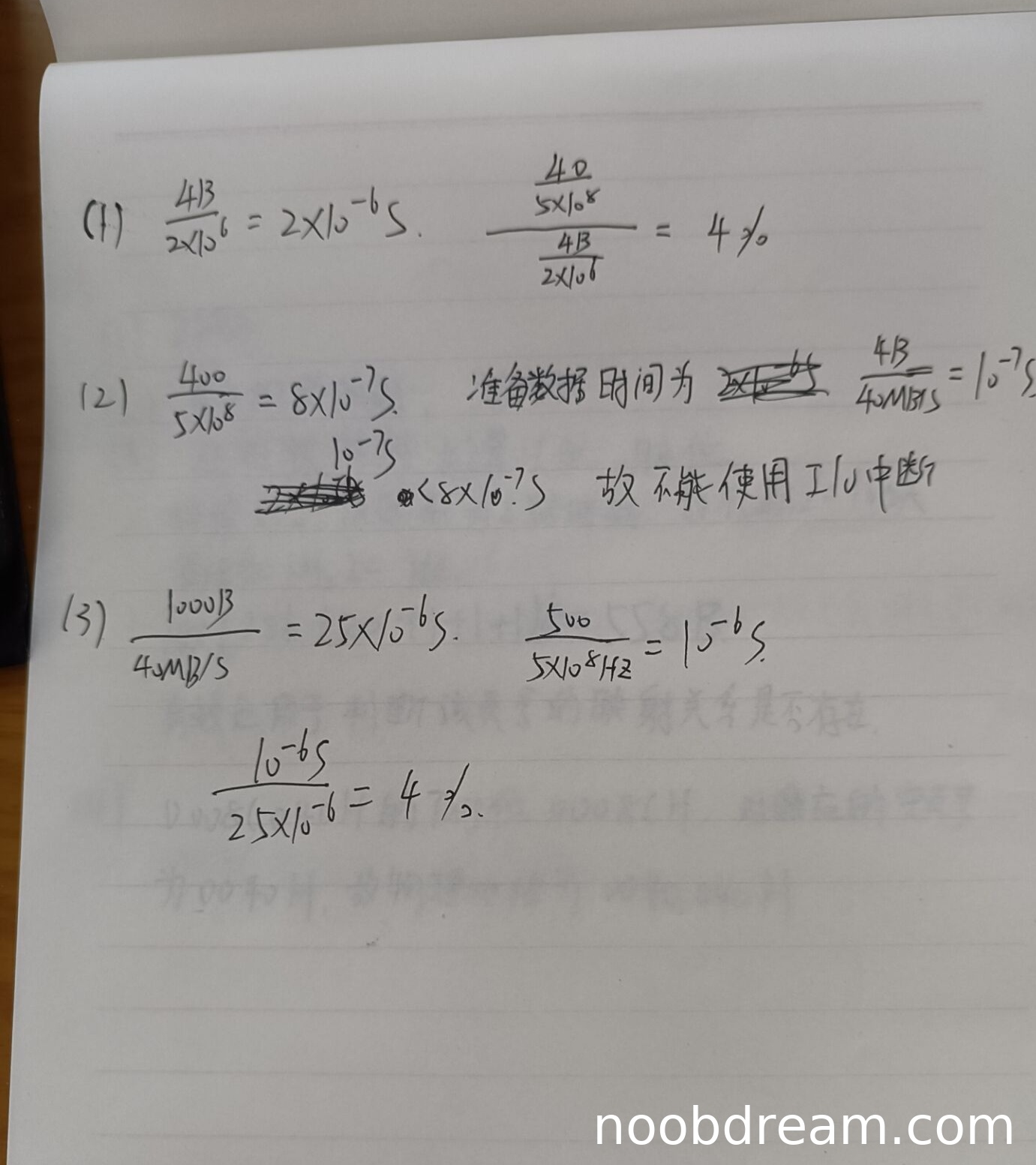 学生正确计算了中断处理时间(400/500MHz=0.8μs)和数据准备时间(4B/40MBps=0.1μs),并得出"不能使用I/O中断"的正确结论。虽然数据准备时间计算中误写为4MB/s(应为40MB/s),但根据数值10⁻⁷s可判定为识别错误,不扣分。得分:2分