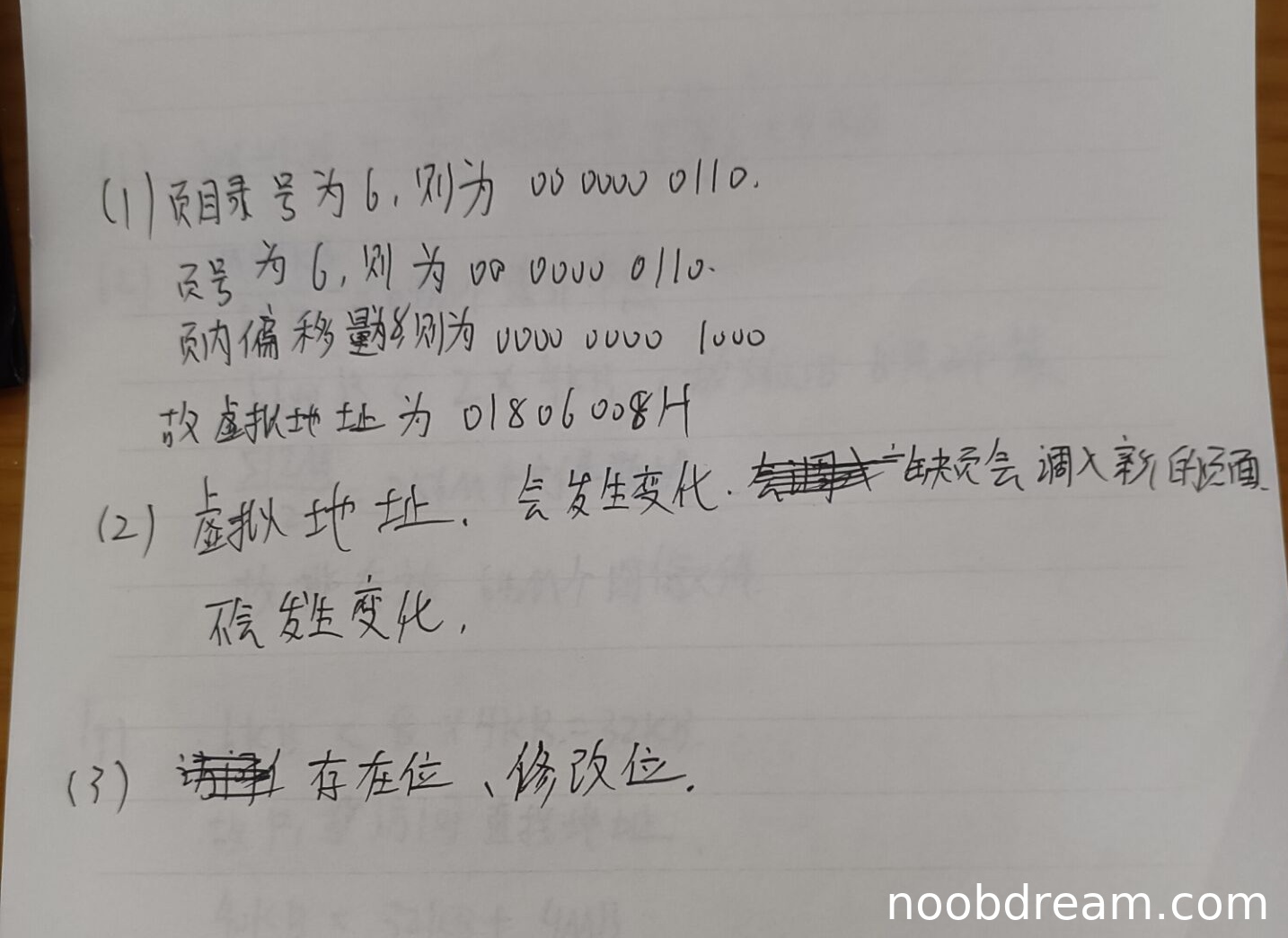 第二问:学生回答"会发生变化"正确,但理由"会因缺页会调入新的页面"不准确(标准理由是进程切换导致页目录变化)。考虑到理由部分存在识别错误可能,且核心结论正确,不扣分。