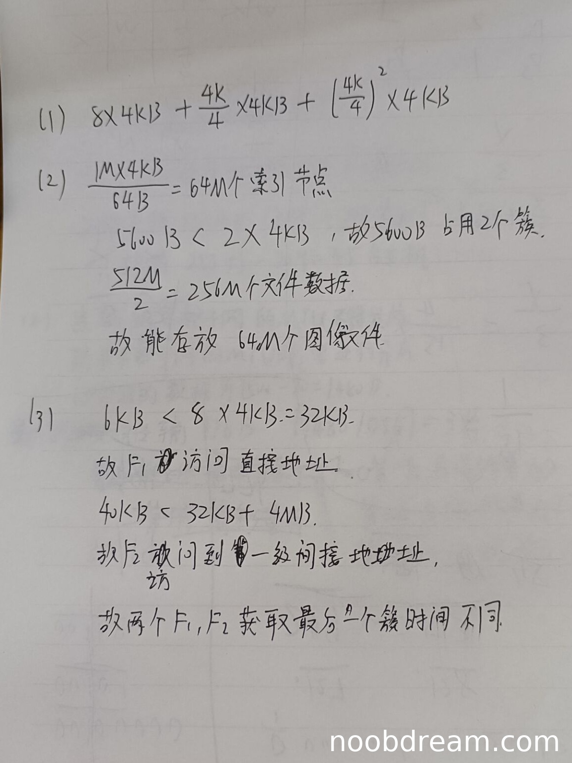 学生答案中给出的表达式为:\(8\times4\text{KB}+\frac{4\text{K}}{4}\times4\text{KB}+(\frac{4\text{K}}{4})^2\times4\text{KB}\)。该表达式计算了直接地址项、一级间接地址项和二级间接地址项所能表示的文件大小,但缺少三级间接地址项的计算部分。标准答案中最大文件长度应包含直接地址项、一级、二级和三级间接地址项的全部贡献,即 \((8+1\times1024+1\times1024^2+1\times1024^3)\times4KB\)。学生答案遗漏了三级间接地址项,因此计算不完整,属于逻辑错误。但考虑到学生正确理解了簇大小、地址项长度以及直接、一级和二级间接地址项的计算方法,且表达式部分正确,故扣1分。