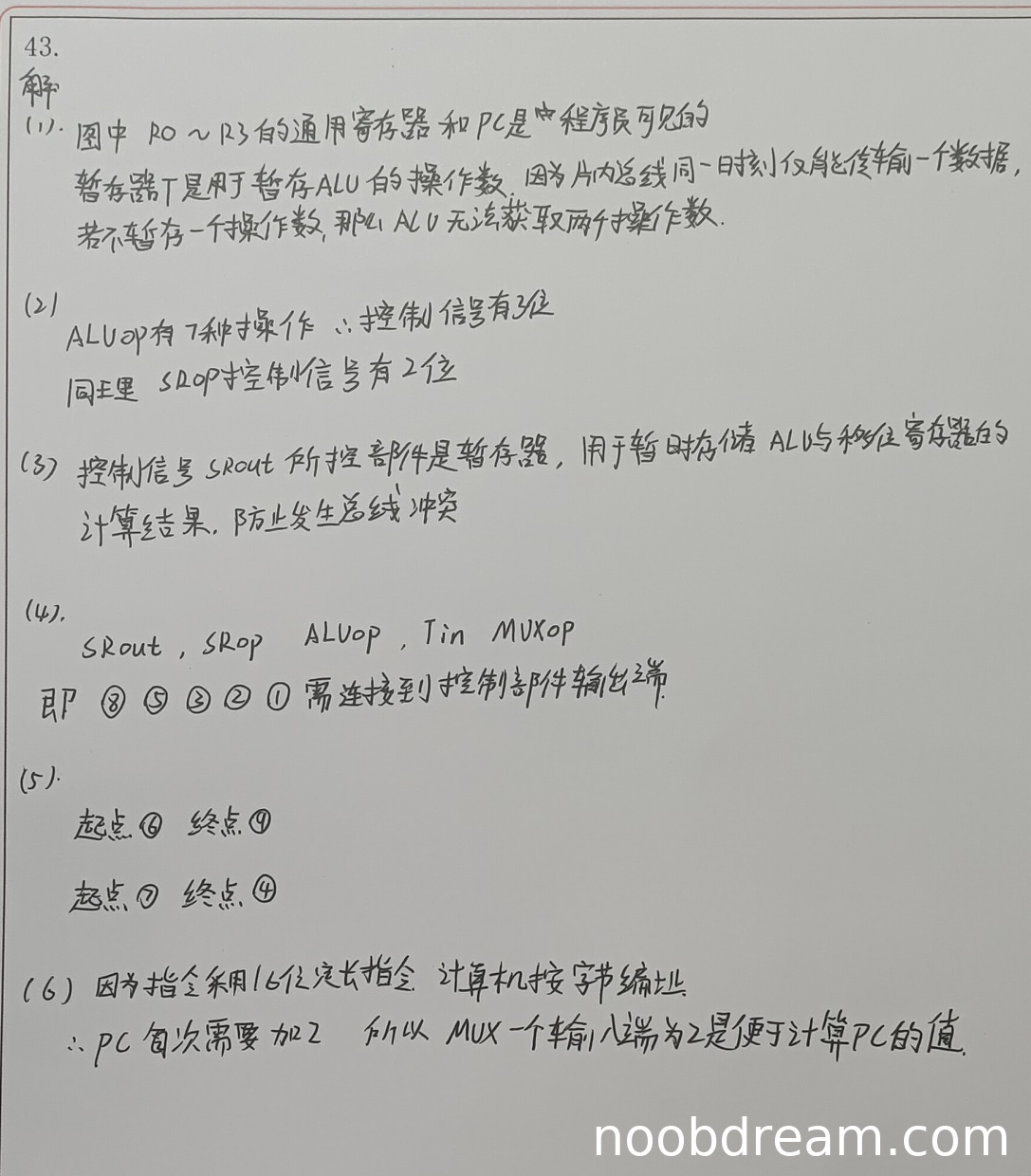学生正确指出ALUop需要3位(7种操作),SRop需要2位(3种操作),与标准答案完全一致。得2分。