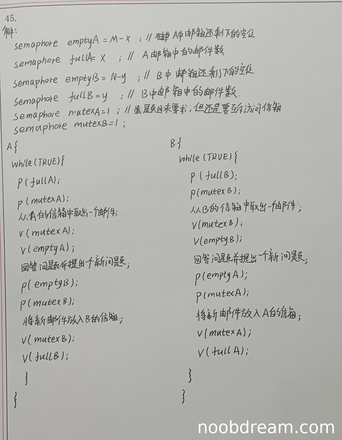 - 取邮件前先P(fullA)检查是否有邮件,再P(mutexA)互斥访问