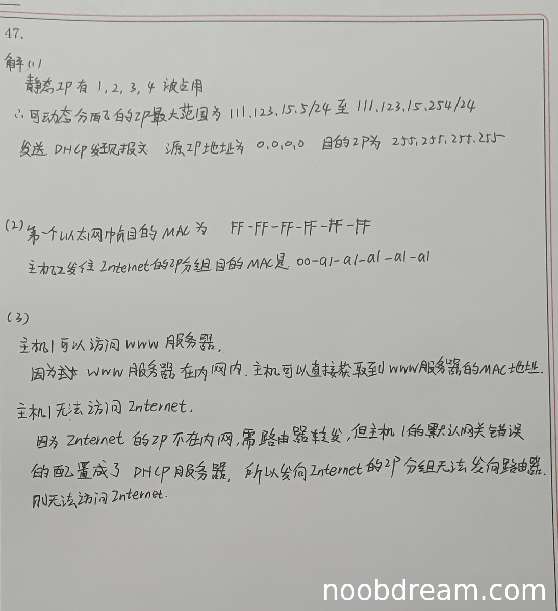 学生答案中DHCP动态分配IP地址范围正确(111.123.15.5/24至111.123.15.254/24),与标准答案一致;DHCP Discover报文的源IP地址(0.0.0.0)和目的IP地址(255.255.255.255)也完全正确。虽然学生答案中使用了"/24"表示子网掩码,但这是正确的网络表示方法,不影响得分。因此本小题得3分。