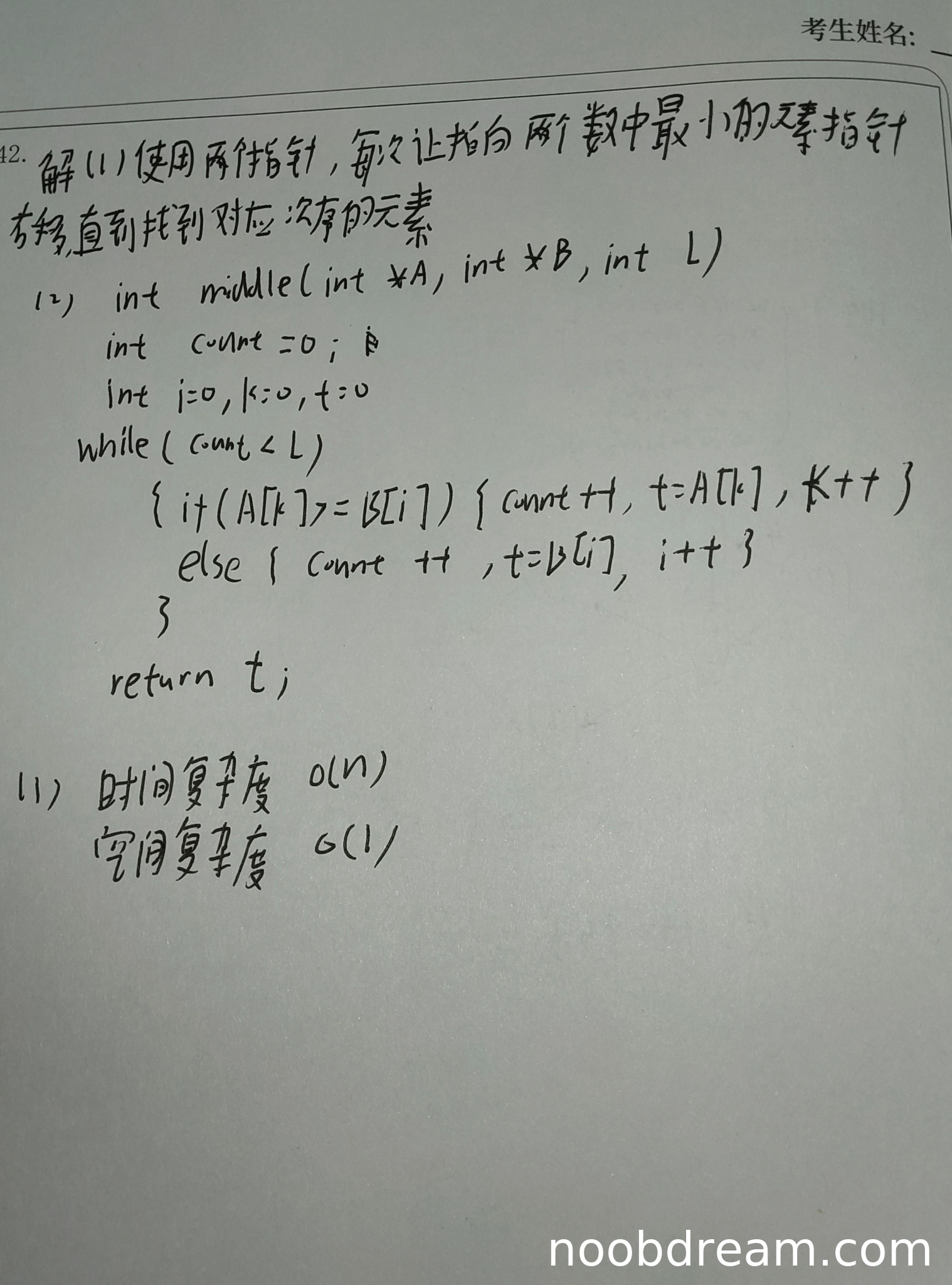 学生正确分析了算法的时间复杂度为O(n)和空间复杂度为O(1),虽然不如标准答案的O(log n)高效,但分析正确。