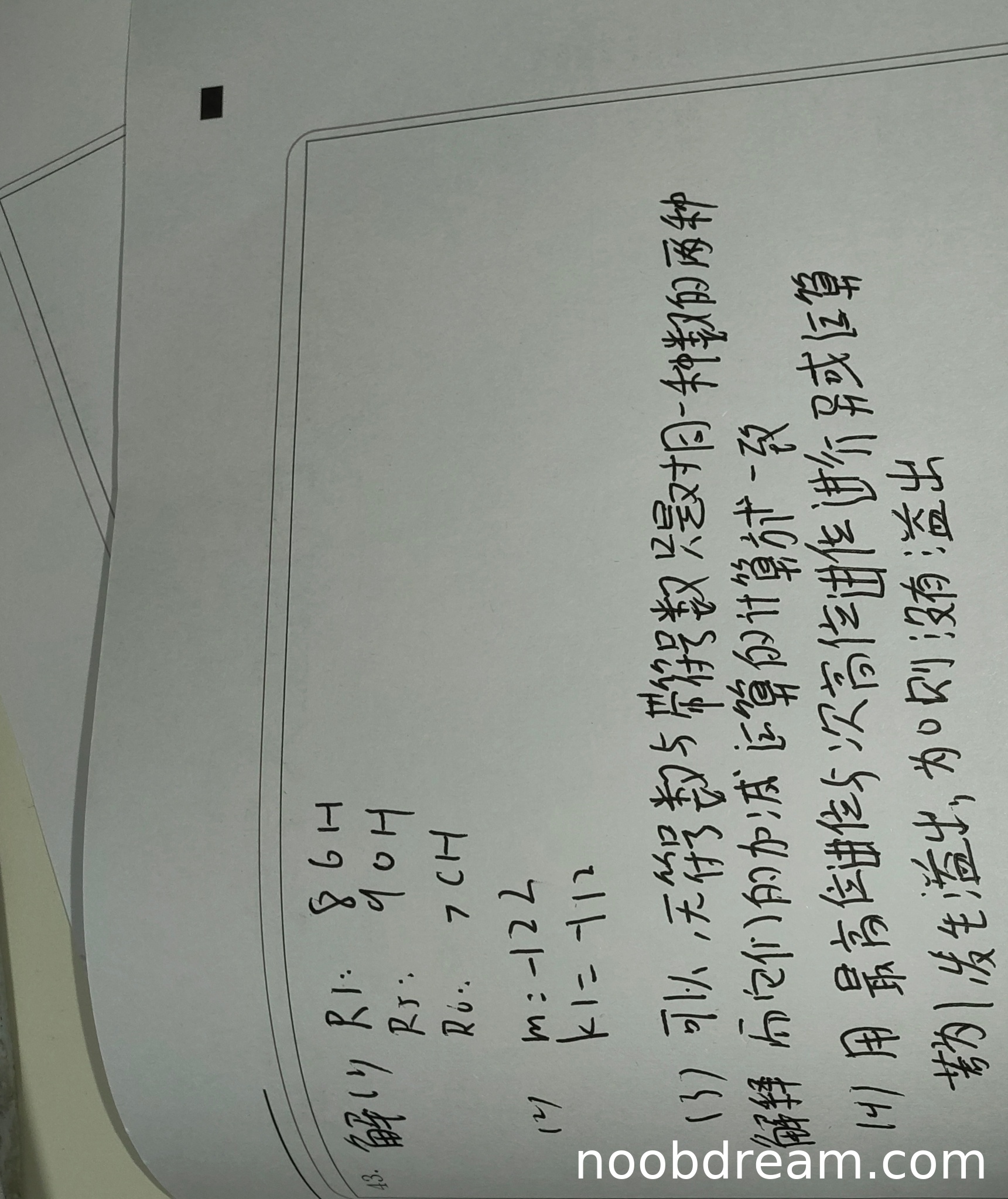 第一次识别结果中,回答“可以”并说明“计算式一致”,但未详细解释补码存储和加减运算的共性,也未提及溢出判断电路可能不同,理由不够完整。第二次识别结果中,回答“无符号数与带符号数是指一种数的两种表示形式”并指出“计算方式有差异”,但未明确说明能否利用同一个加法器实现,且未给出合理理由。综合两次识别,学生基本认识到运算可以共用加法器,但理由不充分,扣1分。本题得1分。