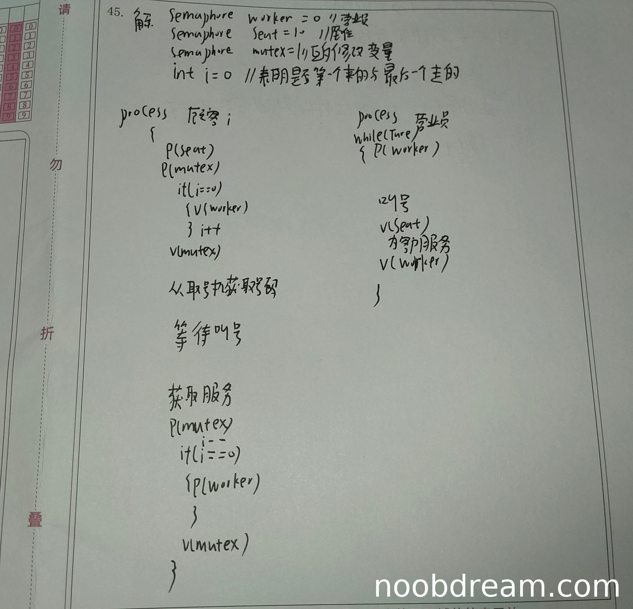 学生定义了三个信号量:worker、seat、mutex,但含义和初值设置存在问题: