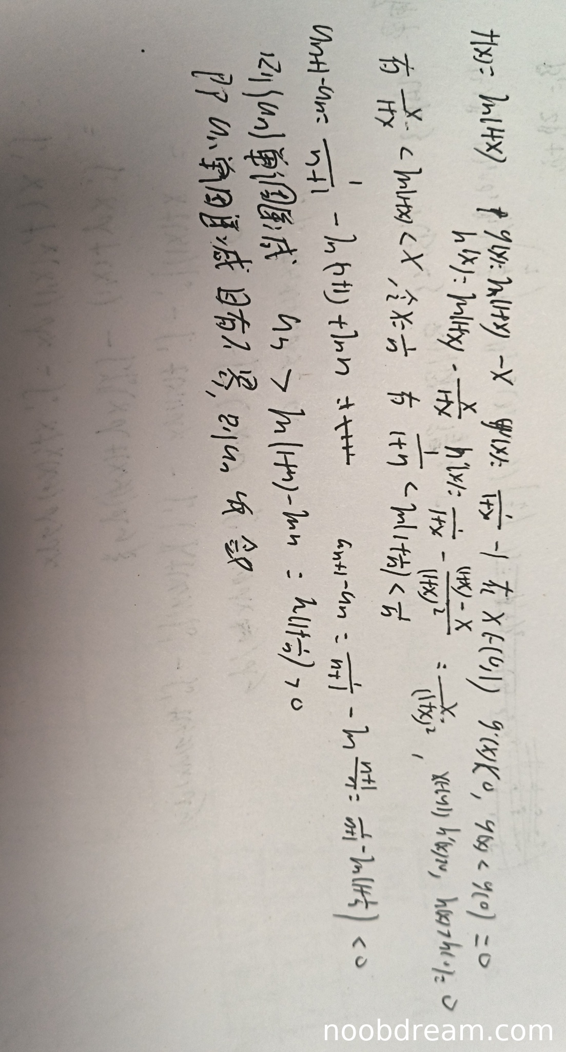 - 定义了 \(g(x) = \ln(1+x) - x\),计算导数 \(g'(x) = \frac{-x}{1+x} < 0\)(在 \(x \in (0,1)\)),得出 \(g(x)\) 单调递减,从而 \(\ln(1+x) < x\)。