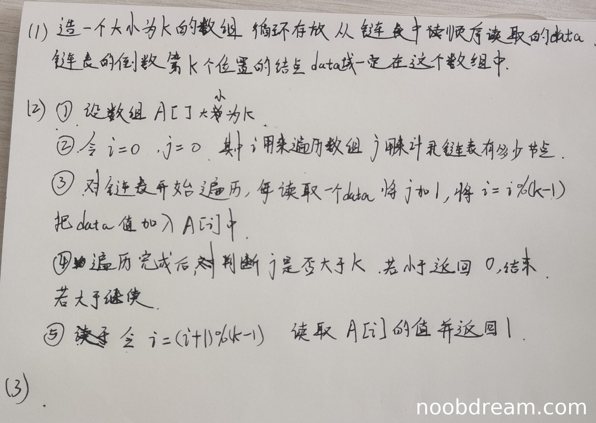 理由:学生的设计思想是使用大小为k的数组循环存储链表数据,通过计算找到倒数第k个结点。这种方法虽然能够解决问题,但需要额外的数组空间,空间复杂度为O(k),且需要遍历整个链表。相比标准答案中仅使用两个指针、空间复杂度O(1)且同样只需一趟遍历的解决方案,效率较低。基本思路正确但不够高效,因此扣2分。