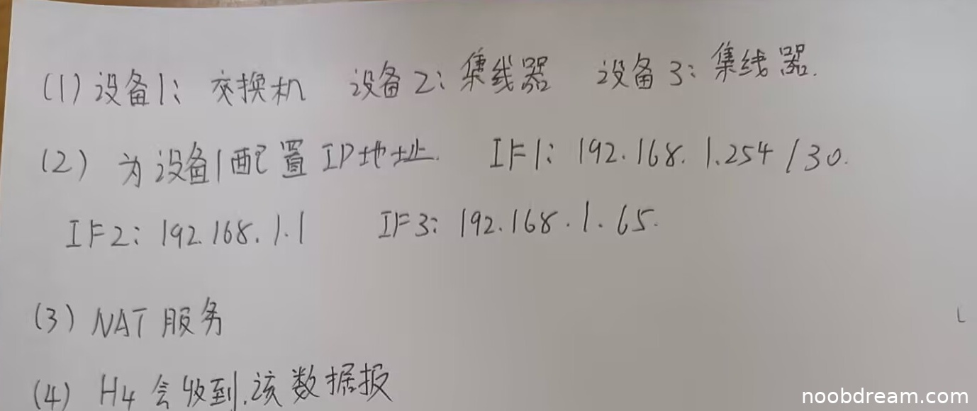 学生答案:设备1需要配置IP地址,接口IF1:192.168.1.254/30,IF2:192.168.1.1,IF3:192.168.1.65。