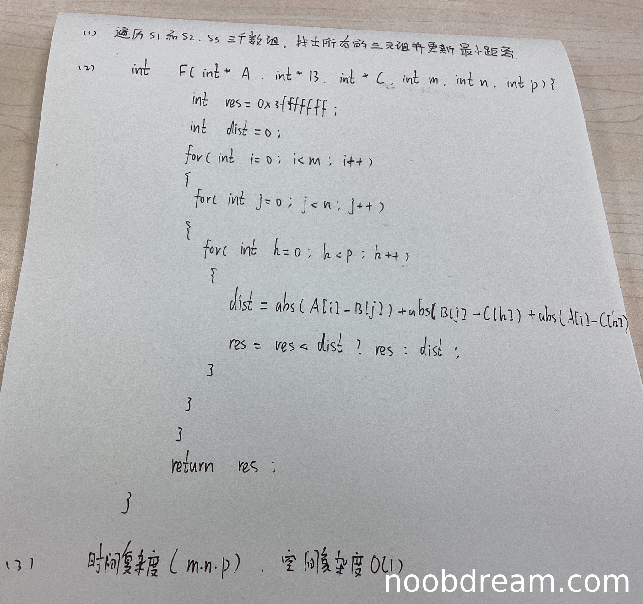 得3分。学生的基本设计思想是遍历三个数组的所有三元组组合,并计算距离更新最小值。这与标准答案中的暴力法思路完全一致,虽然效率不高但设计思想正确。