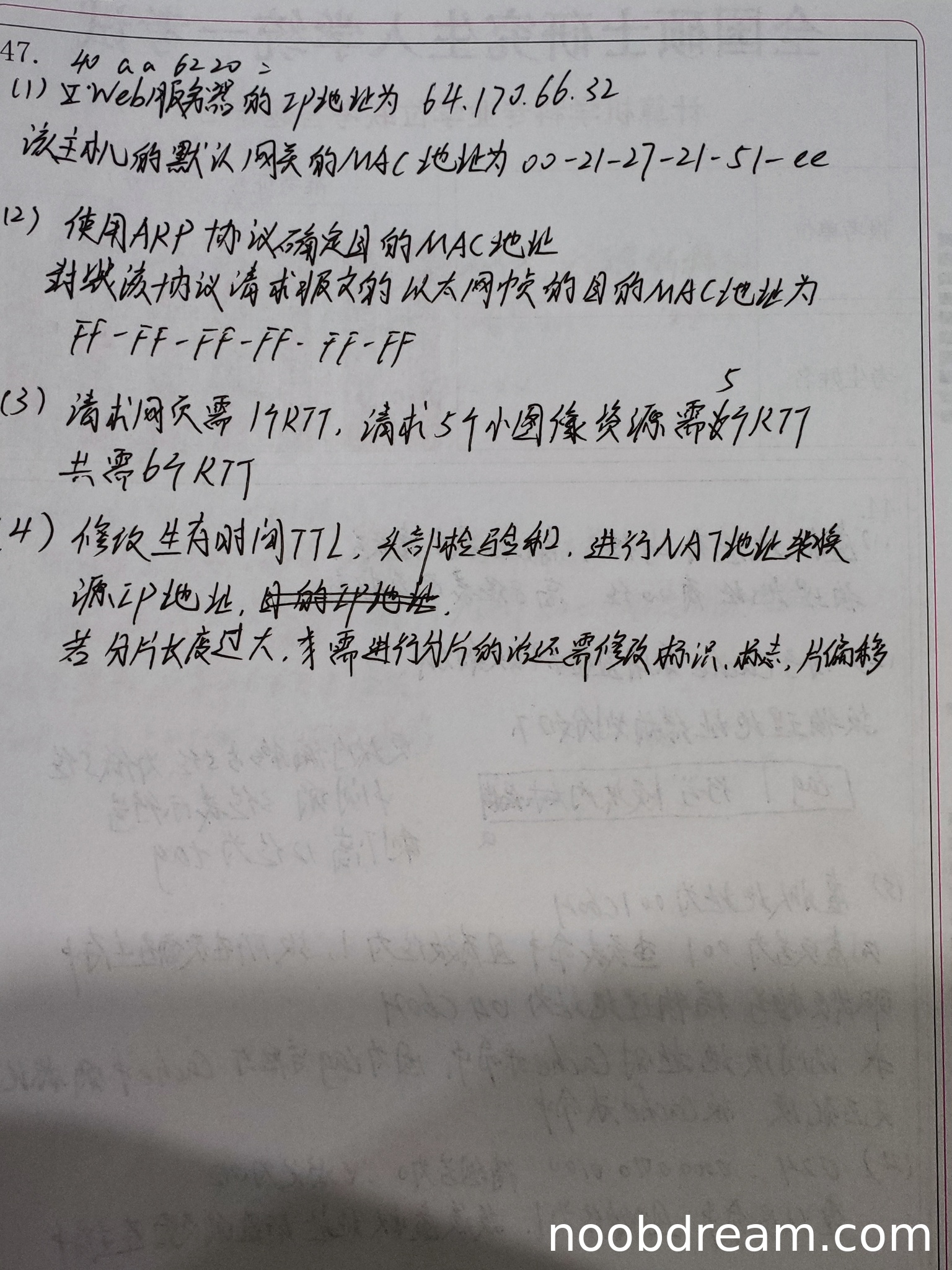 第一问:Web服务器的IP地址,标准答案为64.170.98.32,学生答案为64.170.66.32,其中第二个字节的十六进制应为aa(170),学生识别为66(十六进制42),存在识别错误,但根据禁止扣分规则,判断为误写,不扣分。
