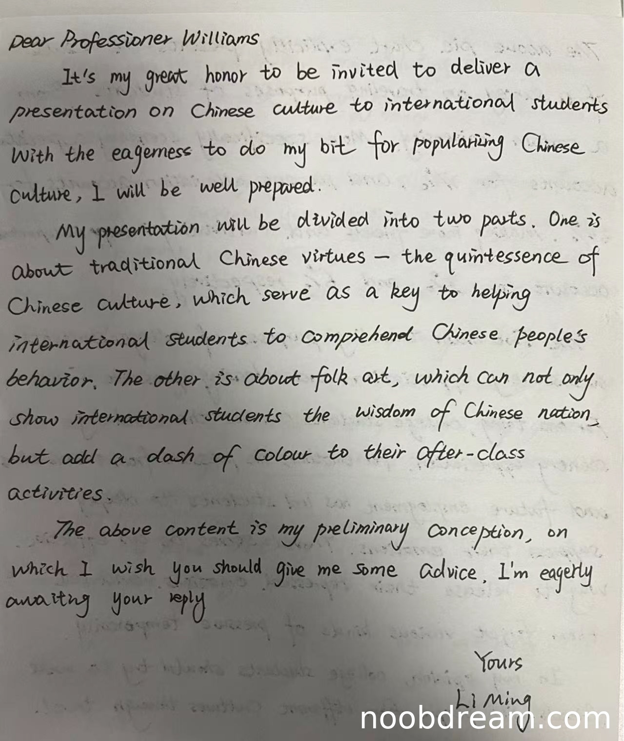理由:作文内容完整覆盖了所有要点。首先,作者表达了接受邀请的荣幸和对推广中国文化的热情;其次,详细说明了演讲的两个部分(中国传统美德和民间艺术)及其意义;最后,请求对方给予建议并期待回复。所有关键信息都已包含。