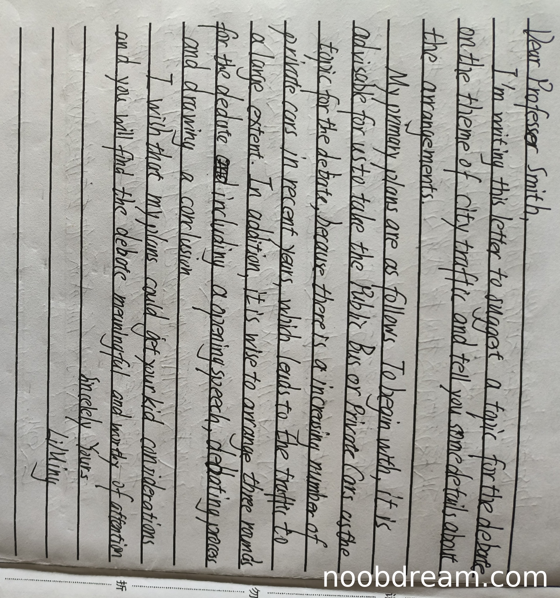 理由:邮件基本完成了题目要求的两个要点:提出了"Public Bus or Private Cars"作为辩题并给出了理由(私家车数量增长导致交通问题),也说明了辩论安排(三个环节)。但理由部分不够充分具体,对"leads to the traffic to a large extent"表述不够清晰,安排部分"debating pacer/debating"表述不够准确。