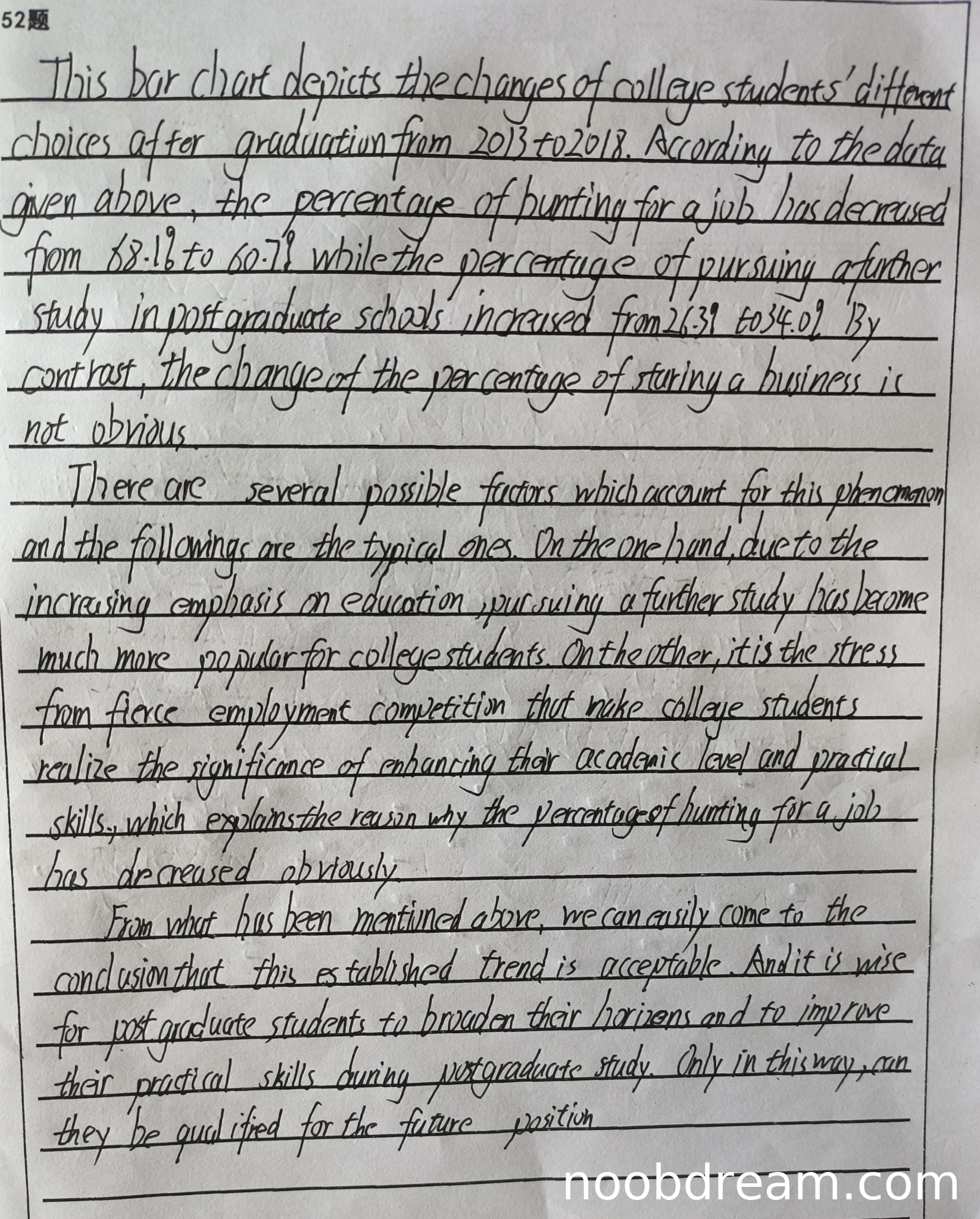 理由:学生提供了合理的分析因素,包括教育重视程度提高和就业竞争压力,逻辑基本连贯。但存在以下问题:1)对就业比例下降原因的解释不够准确(实际上可能是更多学生选择升学导致就业比例下降);2)最后一段建议对象错误地转向"postgraduate students"而非本科毕业生。根据第二档"允许漏掉一两个次重点"的标准,扣2分。