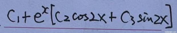 学生作答的两次识别结果均为:\(C_{1}+e^{x}[C_{2}\cos2x + C_{3}\sin2x]\) 和 $C_{1}+e^{x}[C_{2}\cos 2x + C_{3}\sin 2x]$。与标准答案 \(C_{1}+e^{x}(C_{2} \cos 2 x+C_{3} \sin 2 x)\) 相比,仅括号形式不同(方括号与圆括号),这属于书写习惯差异,不影响数学含义。微分方程的特征方程为 \(r^3-2r^2+5r=0\),解得 \(r=0\) 和 \(r=1\pm 2i\),通解结构正确。无逻辑错误,符合通解形式。因此得5分。