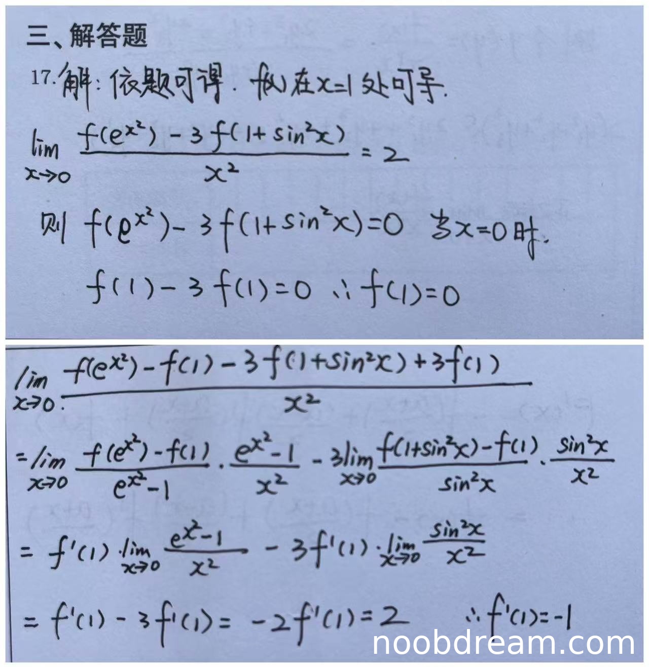 学生作答的两次识别结果均正确解答了问题,思路与标准答案一致。第一次识别中,学生正确利用连续性得到 f(1)=0,然后通过导数定义将极限拆分为两个部分,并正确计算得到 f'(1)=-1。第二次识别同样正确,详细解释了每一步的逻辑。没有逻辑错误,计算正确。