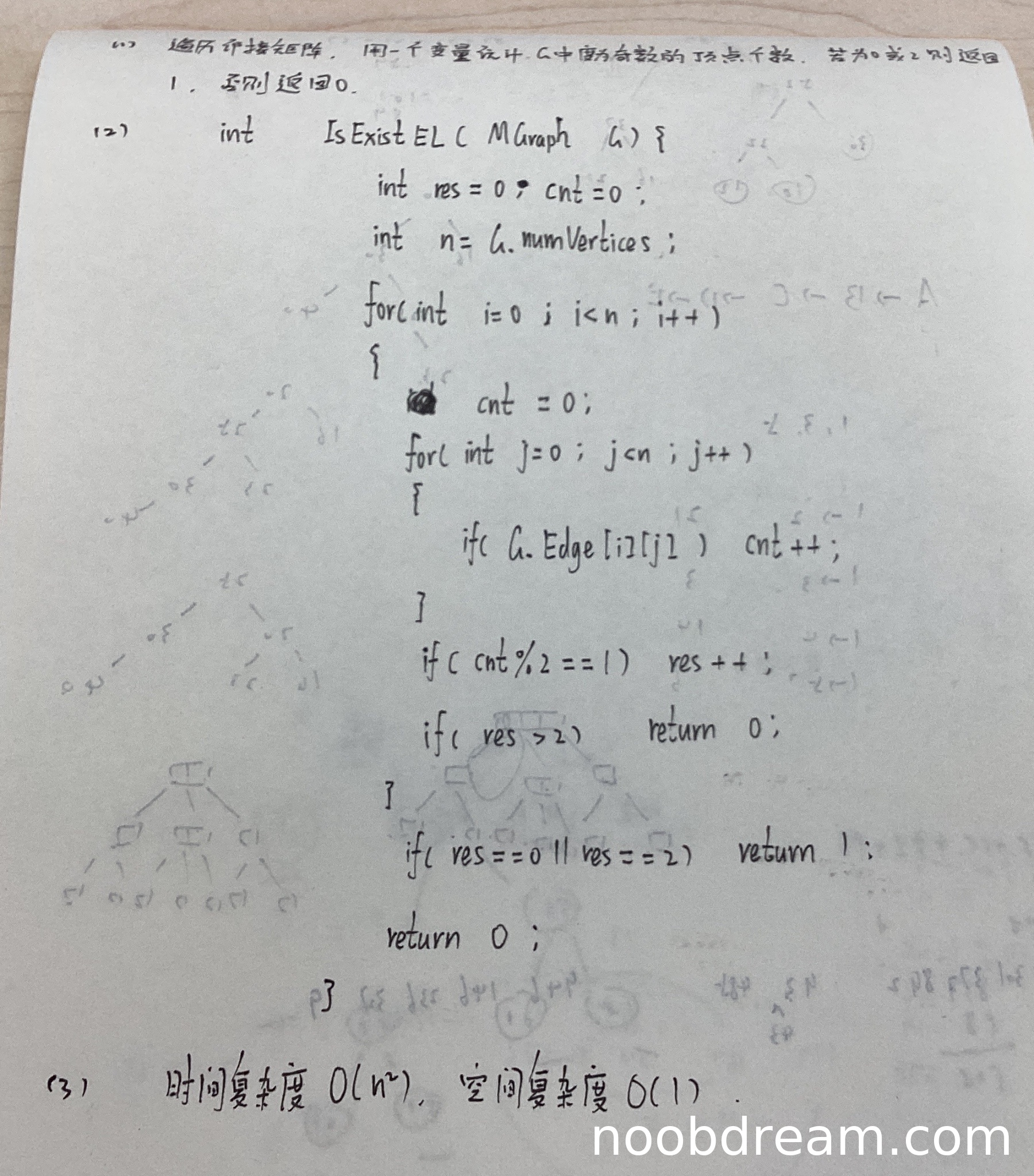 代码实现与标准答案功能等价,只是实现方式略有不同。扣1分是因为代码中变量命名"res"和"cnt"的含义不够清晰(res表示奇度顶点计数,cnt表示当前顶点度数),但这是风格问题而非逻辑错误。因此得8分。