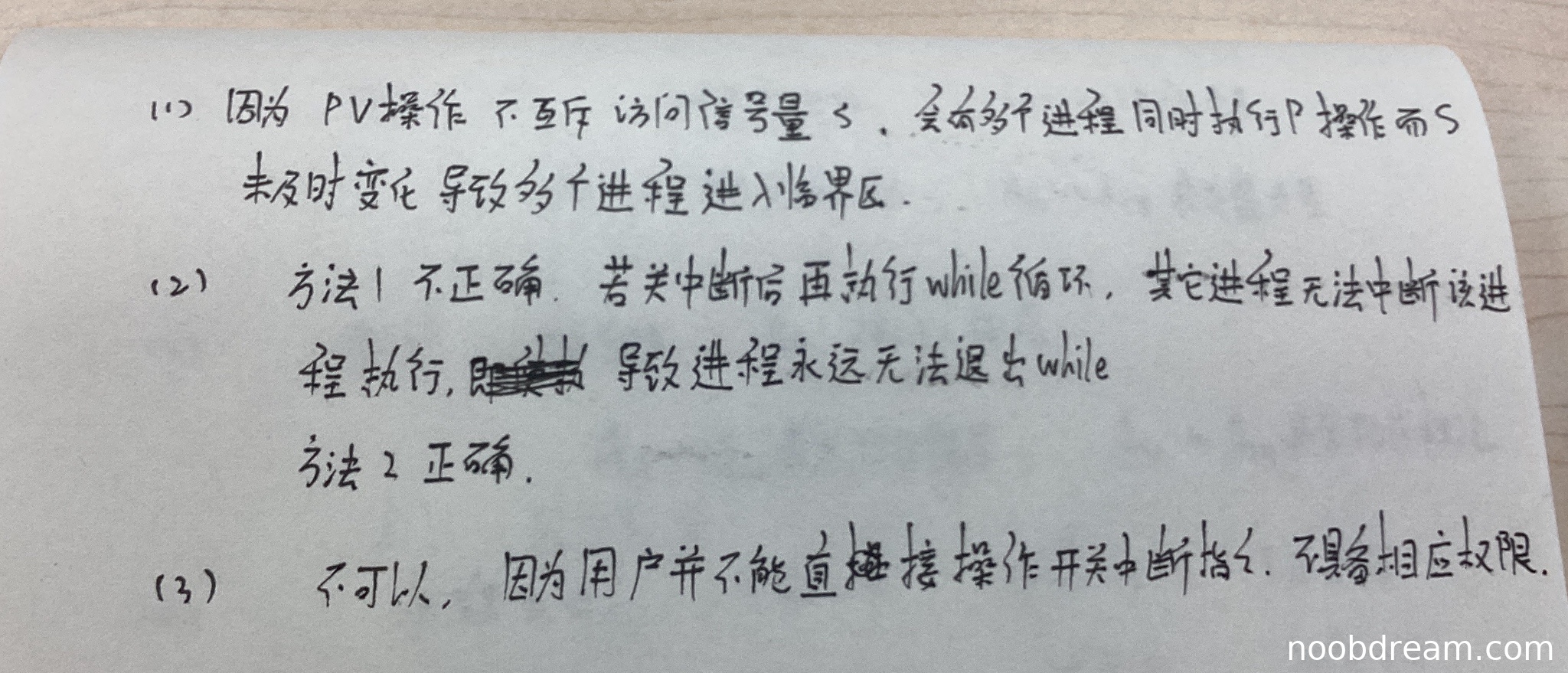 学生正确判断了方法1不正确(理由:关中断后其他进程无法修改S,导致死循环)和方法2正确。这与标准答案完全一致。得3分。