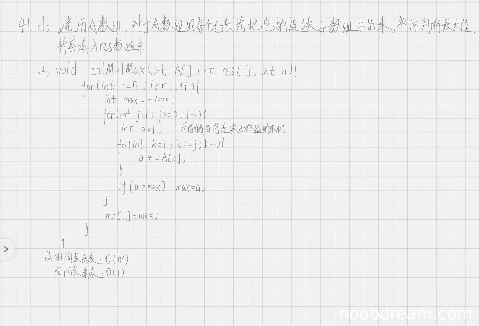 得2分。学生的代码实现了暴力解法,逻辑上是正确的,能够计算出正确结果。但是算法效率极低,时间复杂度为O(n³),远未达到题目要求的"尽可能高效"。代码中使用了三重循环,最内层循环计算子数组乘积,这是典型的暴力解法。虽然代码逻辑正确,但由于算法效率问题严重扣分。