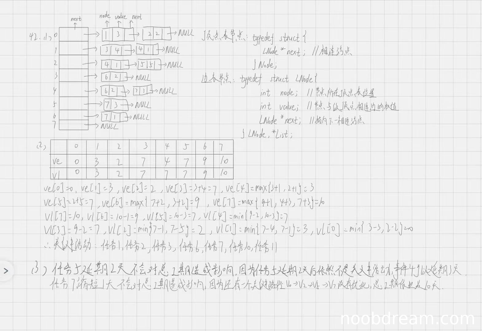 学生答案中顶点表节点和边表节点的结构定义存在逻辑错误:顶点表节点缺少顶点编号字段,边表节点缺少任务编号字段,且字段含义描述不够清晰。虽然邻接表示意图未画出,但根据题目要求需要画出完整的示意图,因此扣2分。得分:2分。