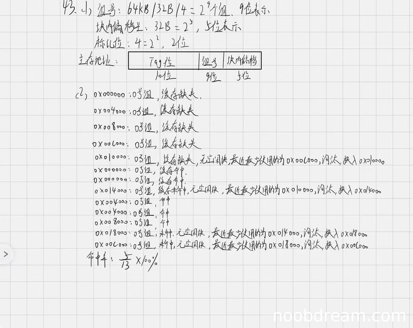 学生第一问中,组号计算正确(9位),块内偏移量计算正确(5位),但标记位计算错误(学生计算为2位或10位,标准答案为12位)。标记位计算逻辑错误,扣2分。此外,地址划分格式中标记位位数错误,但组号和块内偏移量正确,不额外扣分。因此本小题得分为2分。