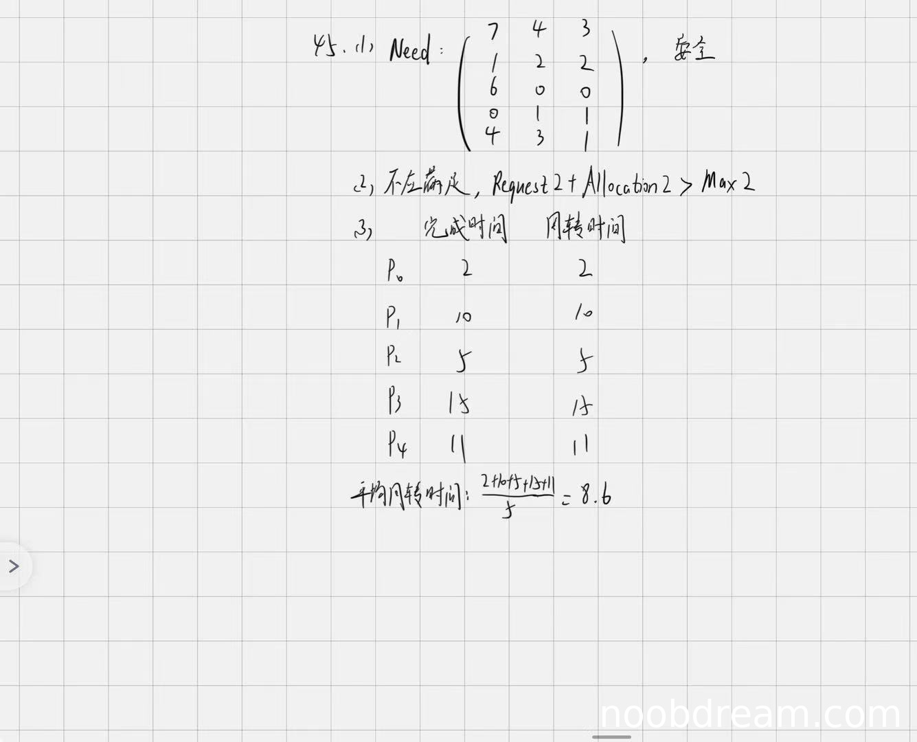 学生正确计算了Need矩阵,且判断系统状态安全,与标准答案一致。得3分。