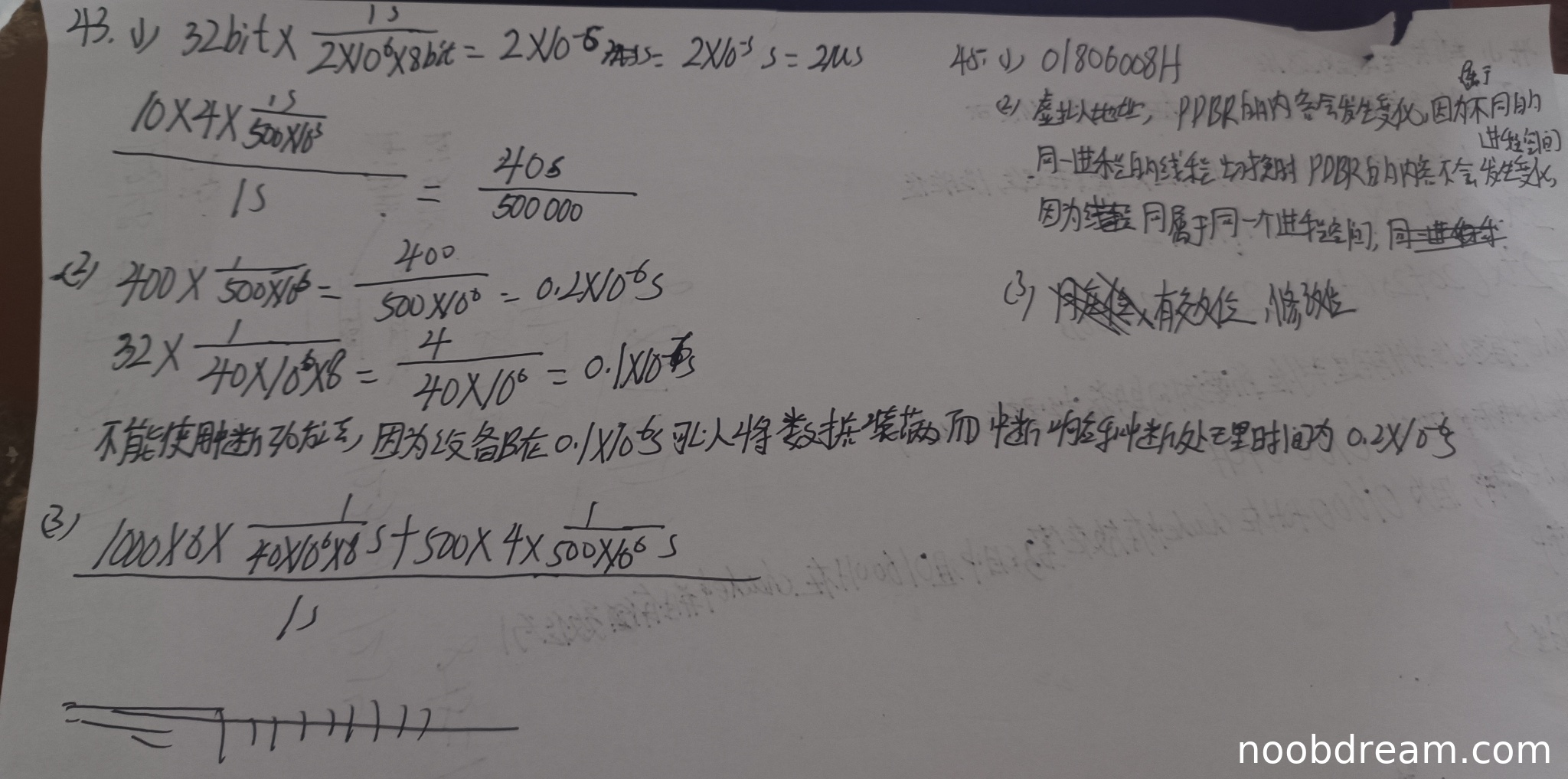 学生正确计算了中断响应时间(0.2μs)和设备B数据准备时间(0.1μs),并得出"不能使用中断"的结论,理由描述基本正确(数据准备时间小于中断处理时间)。虽然时间单位有误写(如0.2×10⁻³s应为0.8μs),但比较逻辑正确。不扣分。