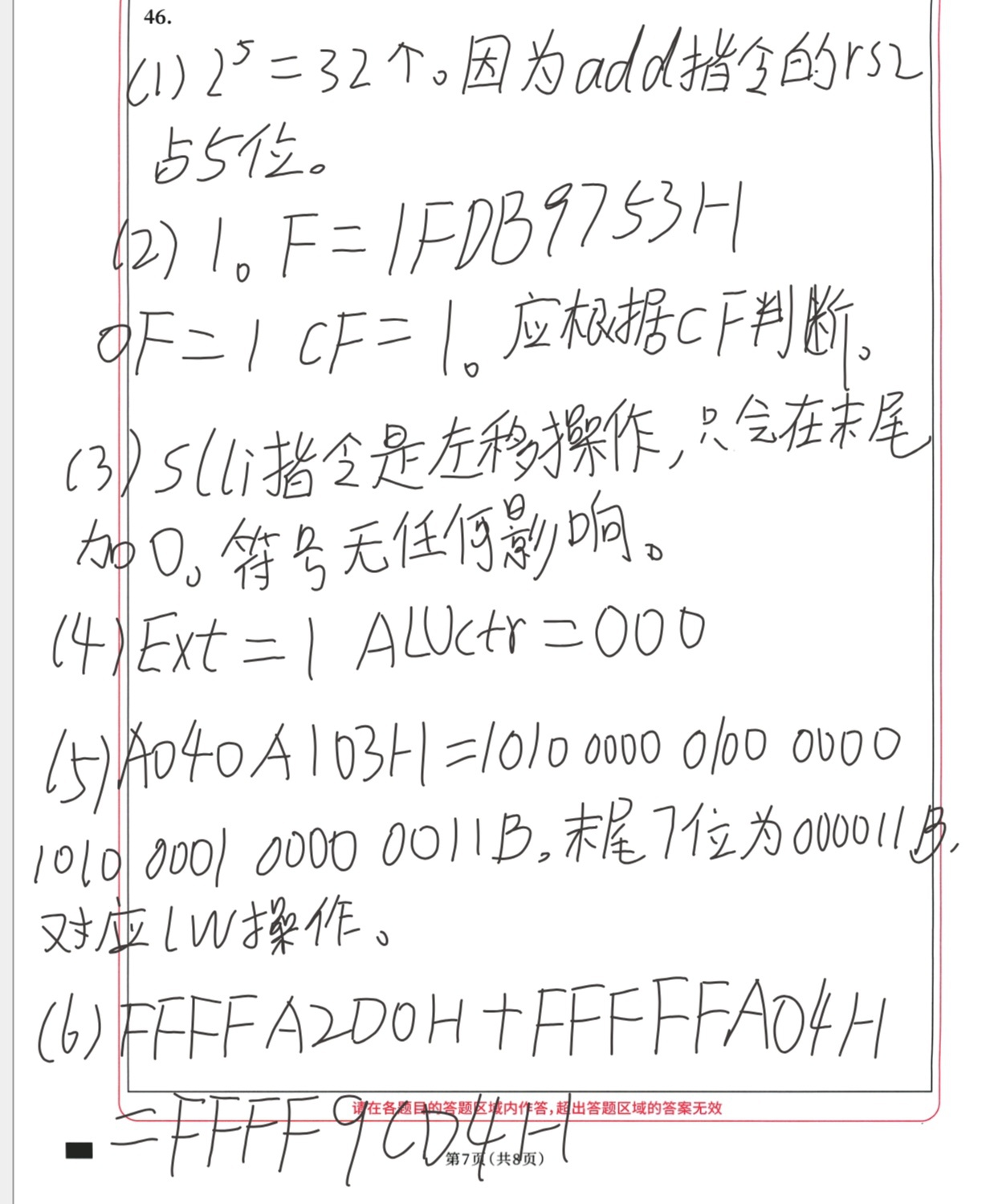 学生回答:ALUBsrc=1;F=1FDB9753H;OF=1;CF=1;应根据CF判断溢出。