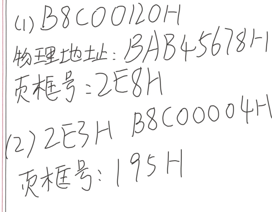 学生答案中,页号为2E3H,与标准答案一致;页表项虚拟地址为B8C00004H,但标准答案为B8C00B8CH,计算错误;页框号为195H,与标准答案一致。因此,页号正确得1分,页表项虚拟地址错误扣2分,页框号正确得1分,本小题得2分。