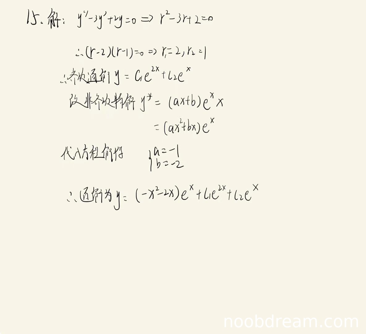 学生正确写出特征方程 \(r^2 - 3r + 2 = 0\),并正确解得特征根 \(r_1 = 2, r_2 = 1\),得到齐次通解 \(y = C_1e^{2x} + C_2e^x\)。此部分与标准答案完全一致,得3分。