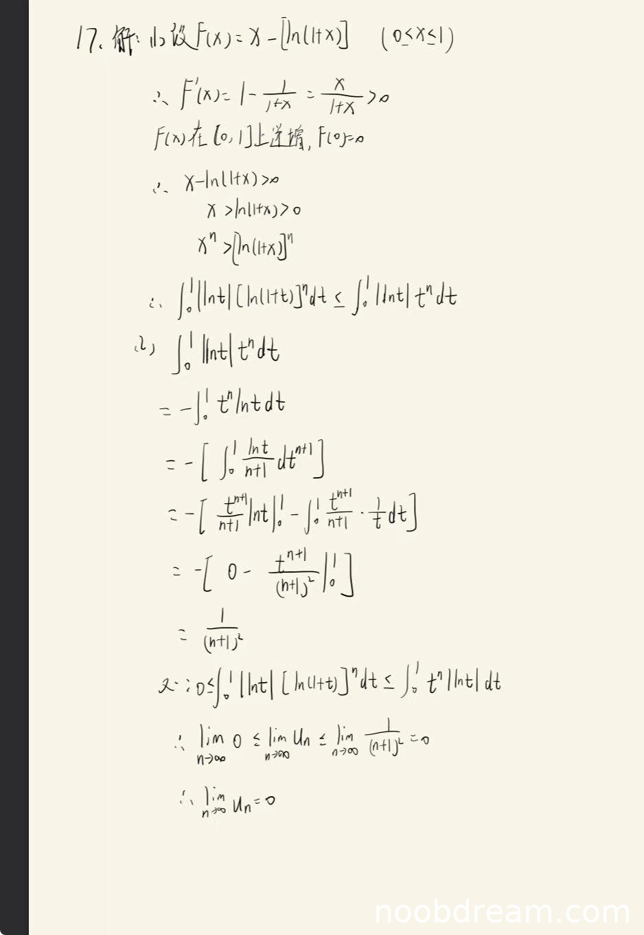 学生正确构造了函数 \(F(x) = x - \ln(1+x)\),并求导得到 \(F'(x) = \frac{x}{1+x} > 0\)(当 \(0 < x \leq 1\) 时),说明 \(F(x)\) 在 \([0,1]\) 上递增。由 \(F(0) = 0\) 得出 \(x > \ln(1+x) > 0\),从而 \(x^n > [\ln(1+x)]^n\)。结合 \(|\ln t| \geq 0\),得到积分不等式。逻辑完整,与标准答案一致。但学生将变量记为 \(x\) 而非 \(t\),这是符号选择问题,不影响逻辑,不扣分。得5分。