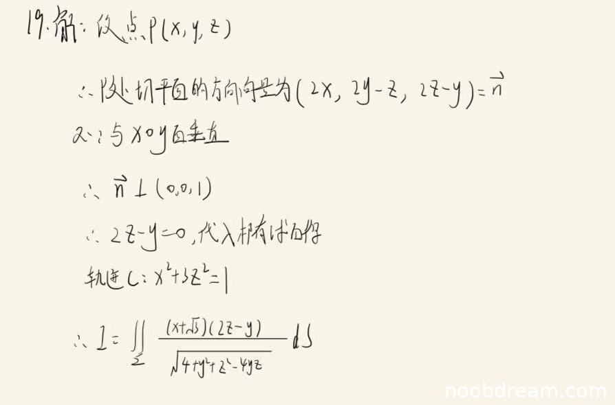 学生正确计算了椭球面法向量为(2x, 2y-z, 2z-y),并利用切平面与xOy面垂直的条件得到2z-y=0,即y=2z。代入椭球面方程得到轨迹C:x²+3z²=1。这一部分思路完全正确,计算准确。