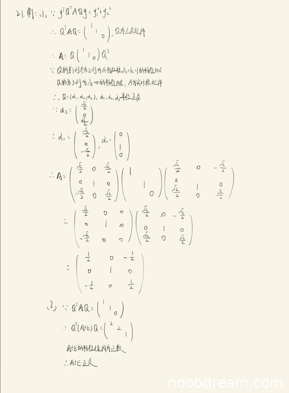第1次识别:学生正确写出正交对角化关系式,但在构造正交矩阵Q时,第一列向量选择与标准答案不同(符号相反),但经过计算后得到的矩阵A与标准答案一致。由于正交矩阵的列向量方向选择不唯一(只要满足正交规范基),且最终计算结果正确,因此不扣分。但存在一处书写不规范:标准形矩阵写为2×2形式而非3×3,但后续使用3×3矩阵计算,可视为笔误。给分6分。