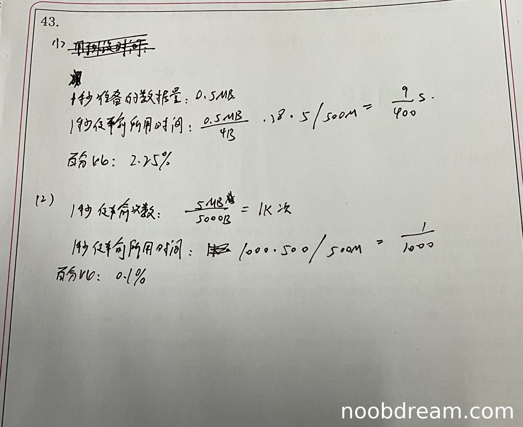- 正确的中断次数应为0.5MB/4B = 125,000次,但学生计算为0.5MB/4B后直接乘以18.5(这个18.5来源不明),然后除以500M,得到时间占比。实际上应该计算每次中断的时钟周期数(5×18+5×2=100),再乘以中断次数,最后除以CPU总时钟周期数(500MHz×1秒=500M)。