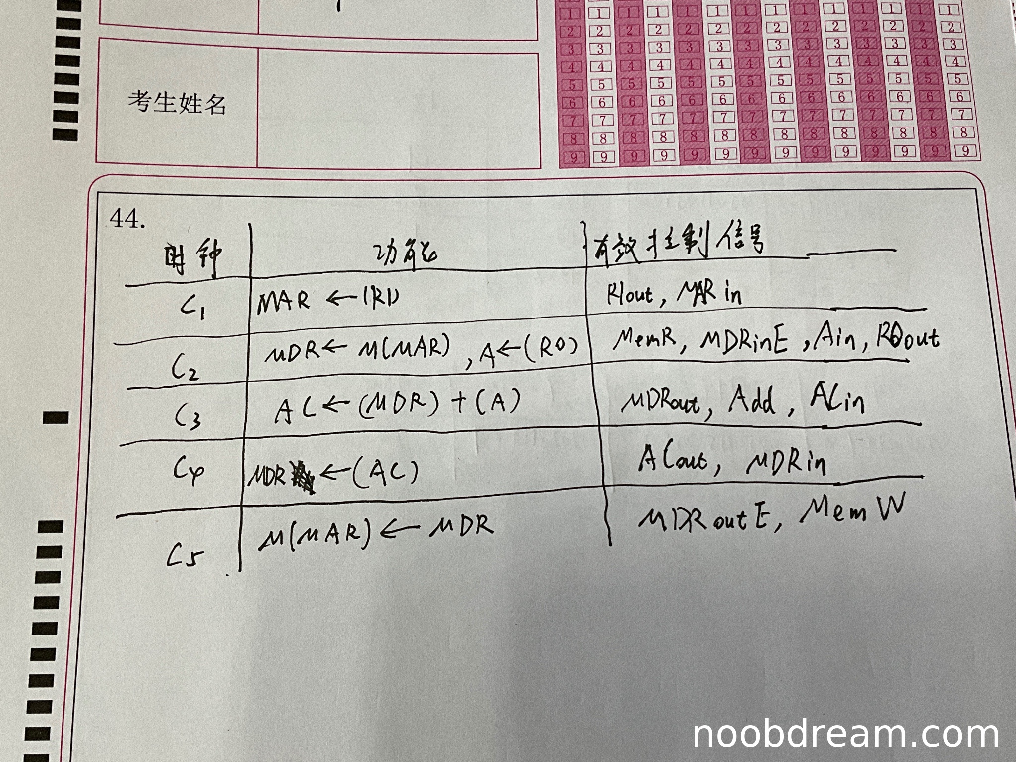 - C3周期:功能描述为AC←(MDR)+(A),但此时MDR中是从内存读取的数据,A中是R0的值,这个操作是正确的。但标准答案中有两种实现方式,一种是C6读内存同时读R0,C7直接相加;另一种是C6只读内存,C7传送到A,C8再相加。学生的实现方式与参考答案一类似,思路正确不扣分。