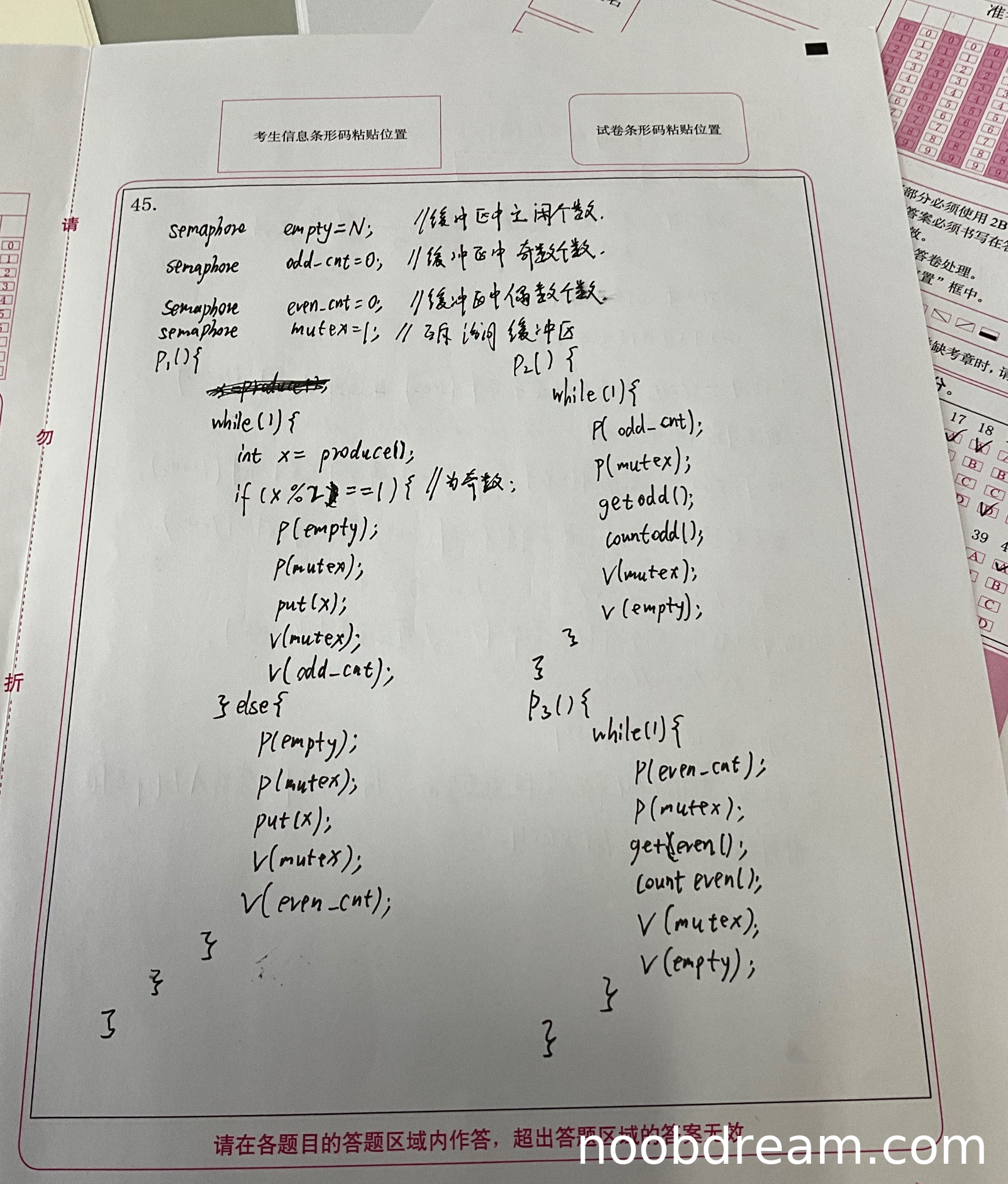 总体评价:学生的解答与标准答案在核心逻辑上完全一致,只是信号量和函数命名有细微差异,这可能是识别误差导致的。所有同步互斥机制都正确实现,包括缓冲区管理、奇偶数分类处理、互斥访问等关键要素。