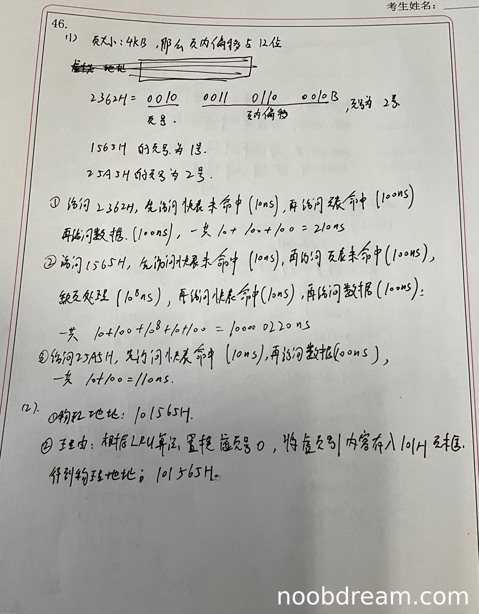 第2次识别结果:物理地址101565H正确,理由与第1次相同,正确,得2分。