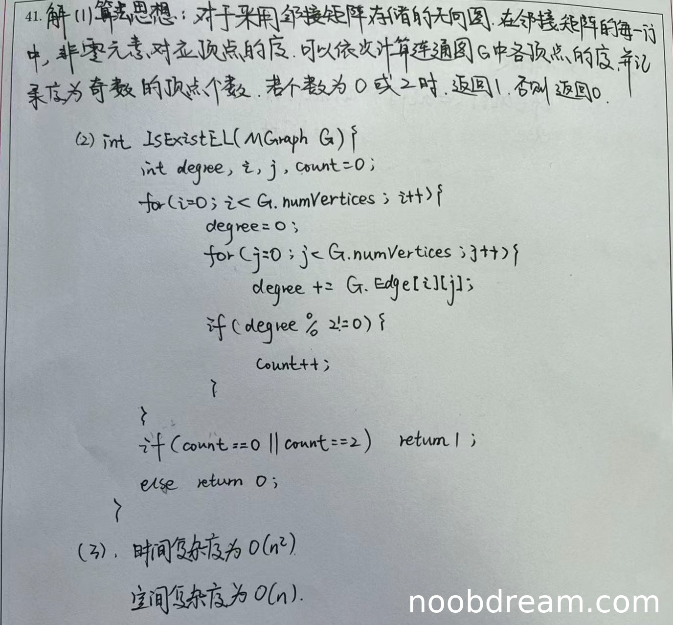 理由:算法实现正确,与标准答案的优化版本基本一致。代码逻辑清晰:通过双重循环遍历邻接矩阵计算每个顶点的度,统计奇数度顶点个数,最后判断是否为0或2。虽然函数名有细微差异(ISExistEL vs IsExistEL),但这属于识别误差,不影响算法正确性。变量命名合理,代码结构完整。