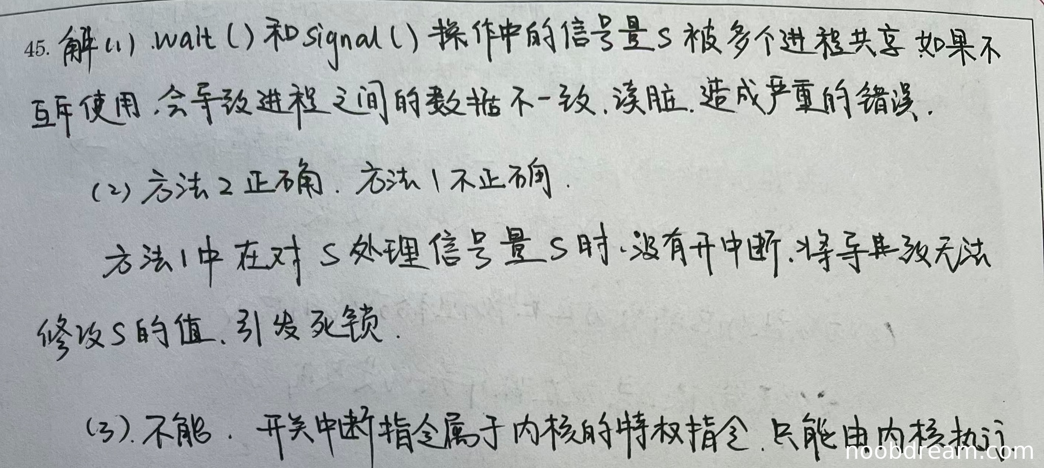 学生正确判断了方法2正确、方法1不正确。对于方法1的错误原因,学生回答"没有开中断,将导致无法修改s的值,引发死锁",虽然表述不够精确(应该是while循环中关中断导致其他进程无法修改S而陷入死循环),但基本指出了问题的本质。标准答案强调的是"其他进程无法修改S的值,while语句陷入死循环",学生的回答在逻辑上是正确的。得3分。