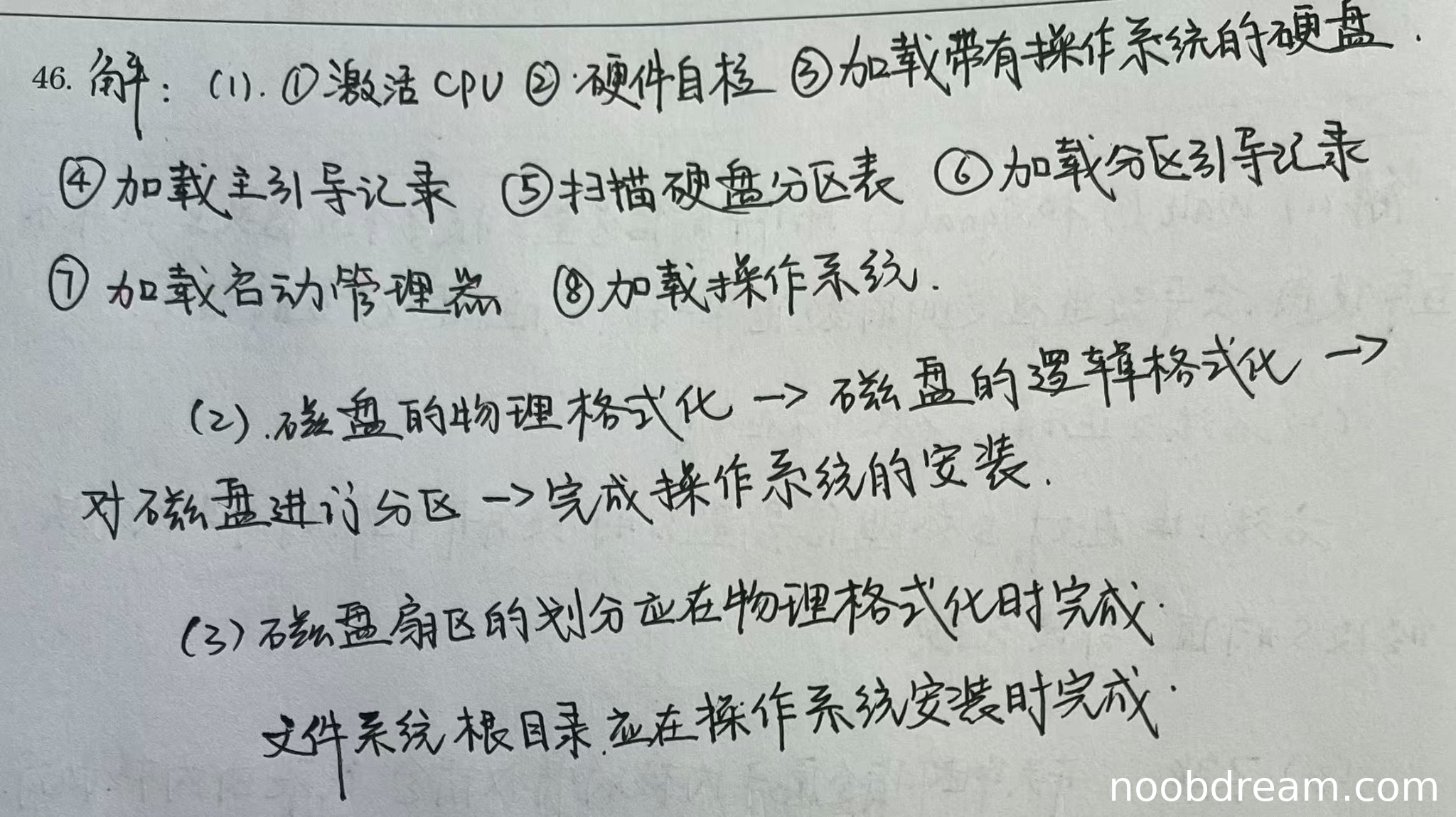 学生回答的顺序为:物理格式化→逻辑格式化→分区→操作系统安装。