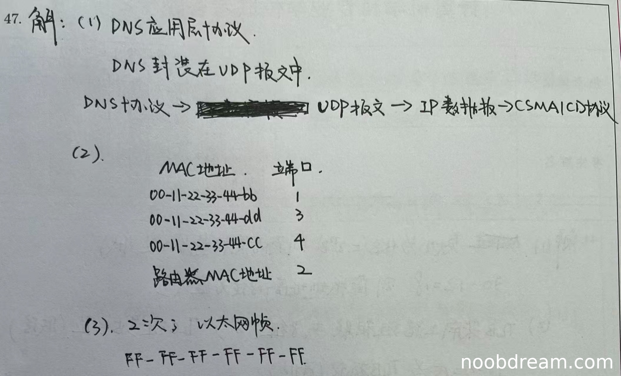 学生正确指出应用层协议是DNS,并正确描述了逐层封装过程:DNS→UDP→IP→CSMA/CD帧。虽然学生使用了"CSMA/CD协议"这一表述不够精确(标准答案为"CSMA/CD帧"),但考虑到这是识别误差且核心逻辑正确,不扣分。得3分。