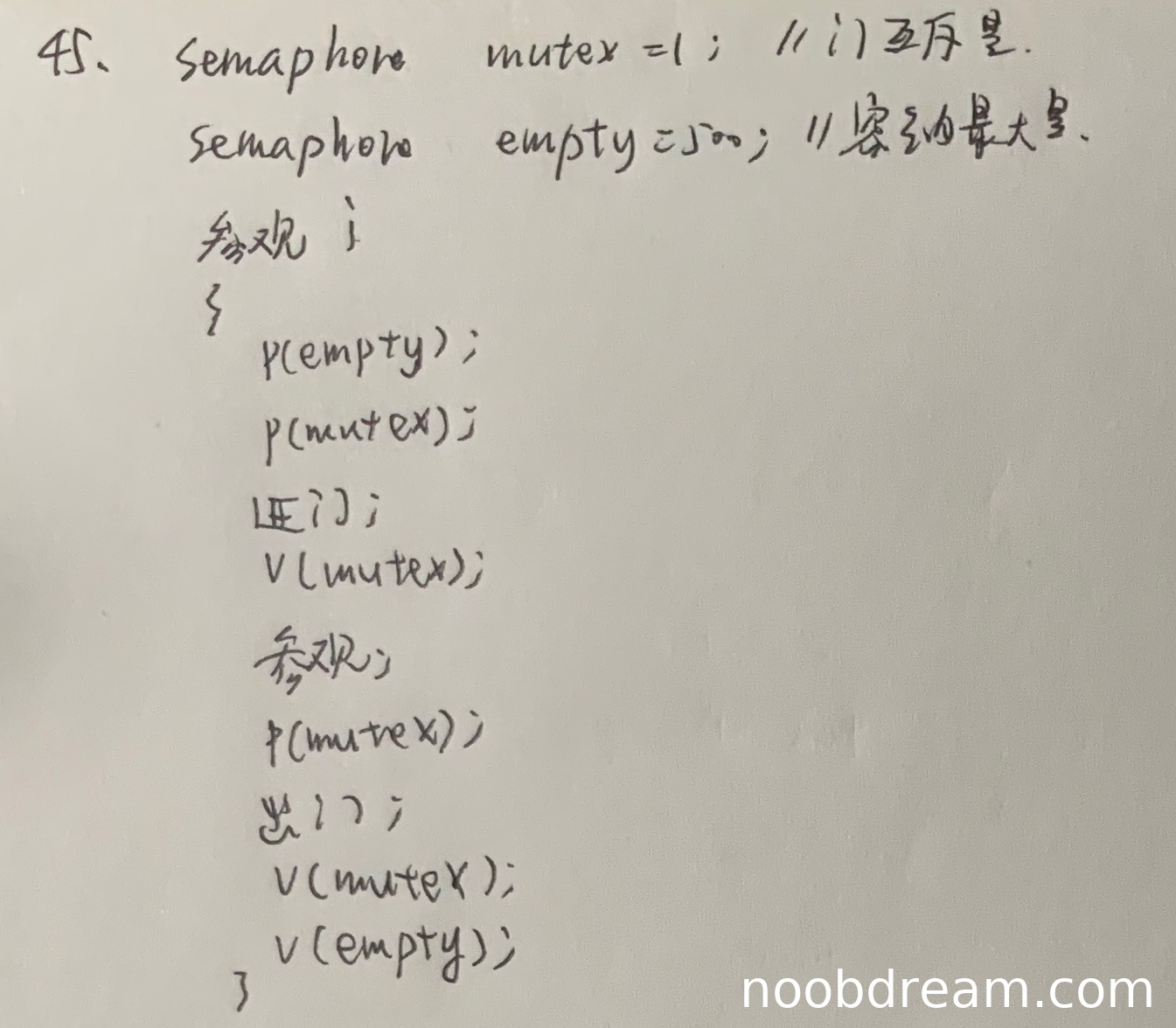 学生对mutex的P、V操作完全正确,在进门和出门操作前后都正确使用了mutex信号量。对empty的P、V操作也正确,在进门前P(empty),在出门后V(empty)。代码逻辑与标准答案一致。得3分。
