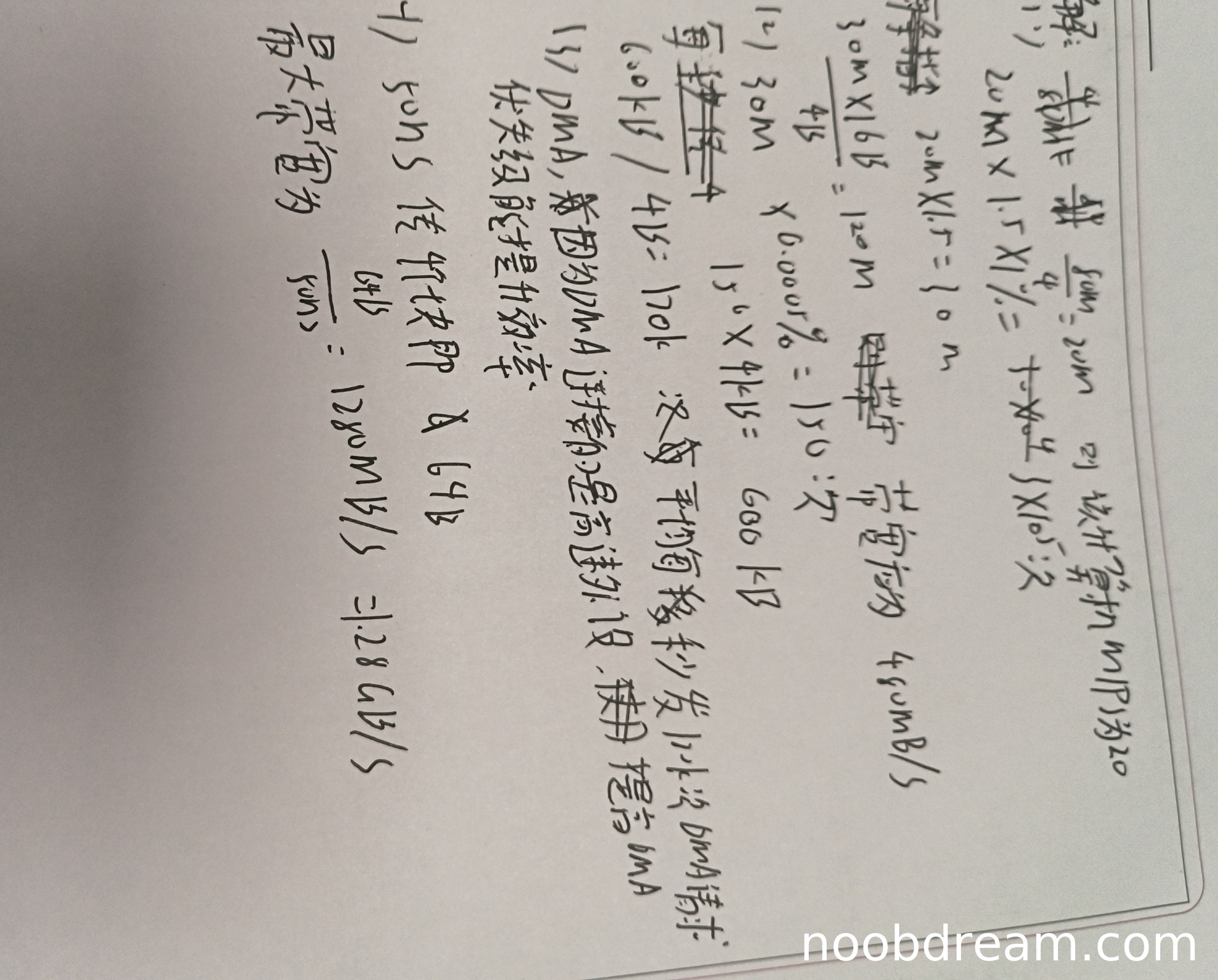 计算DMA请求次数时,"150×4B=600kB"和"600kB/4B=170k"存在逻辑错误,与标准答案1536次不符,扣1分。