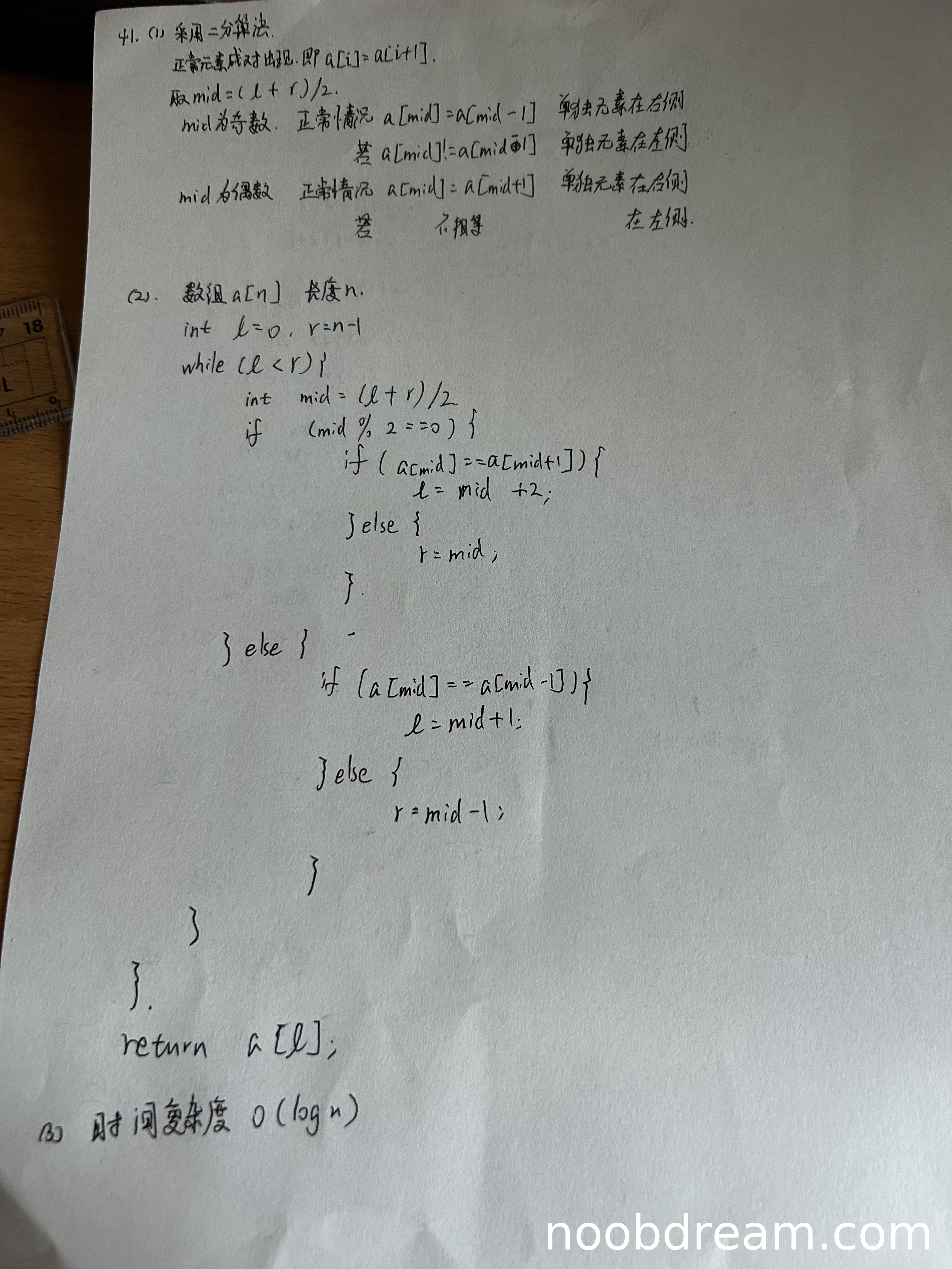 学生提出了二分查找的算法思想,通过判断中间位置的奇偶性以及与相邻元素的比较来确定单独元素的位置。该思路正确且符合题目要求,虽然与标准答案的线性扫描方法不同,但同样能解决问题且时间效率更高。因此得3分。