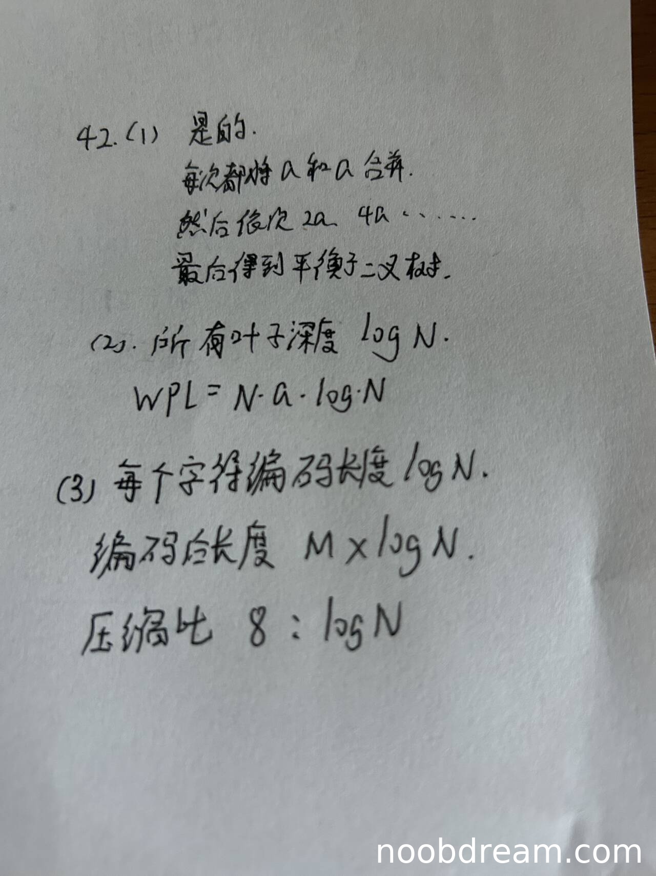 学生回答"编码后长度M×log N"正确,得2分。但"压缩比8:log N"有问题: