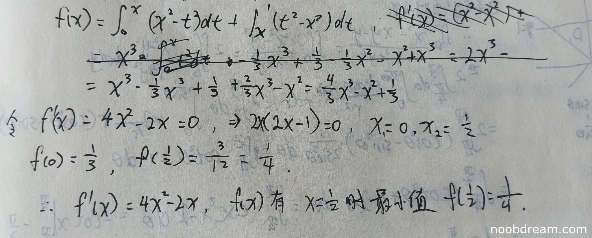 学生在(0,1]区间上正确求导得到f'(x)=4x²-2x,并正确解出驻点x=1/2。但由于没有考虑x>1区间的情况,导数表达式不完整。在最小值求解中,虽然得到了正确的最小值1/4,但缺少对x>1区间函数值的比较。扣1分。