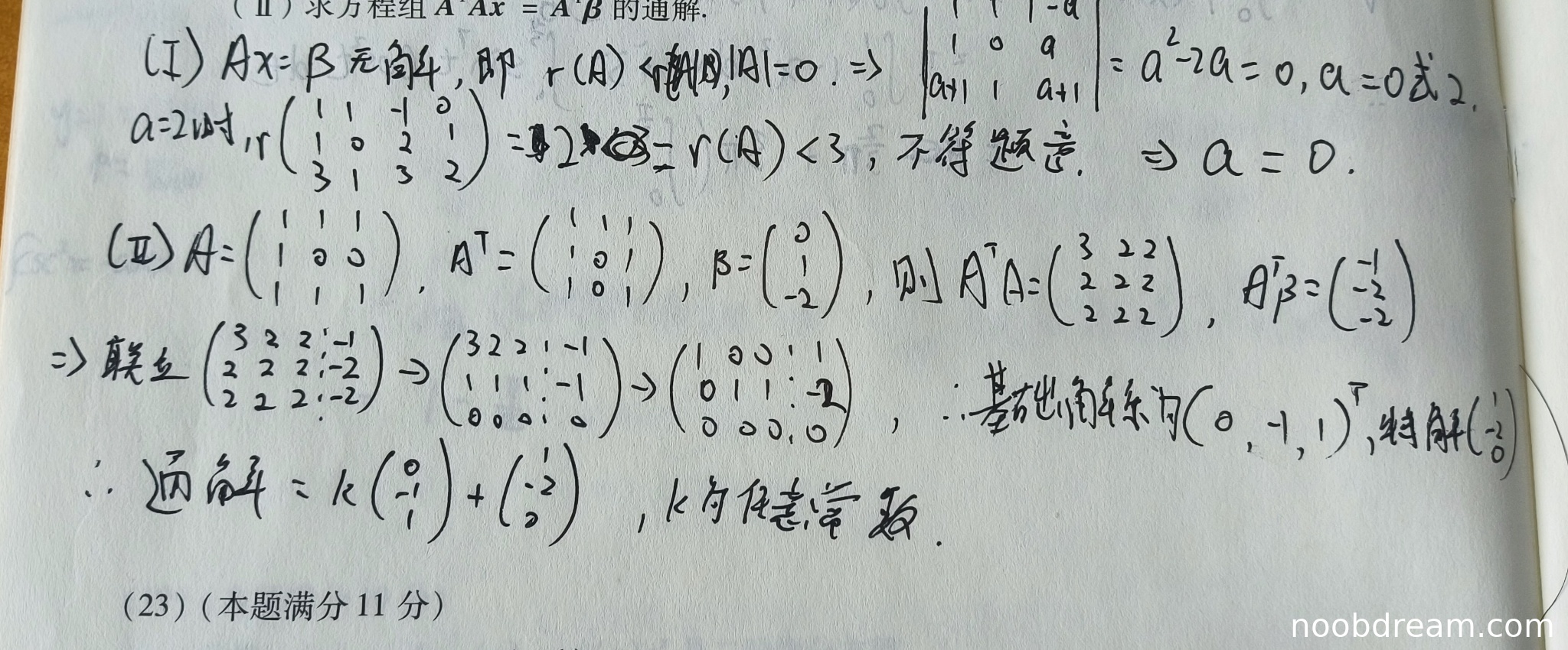 学生正确计算 A^TA 和 A^Tβ,建立增广矩阵并进行行变换。